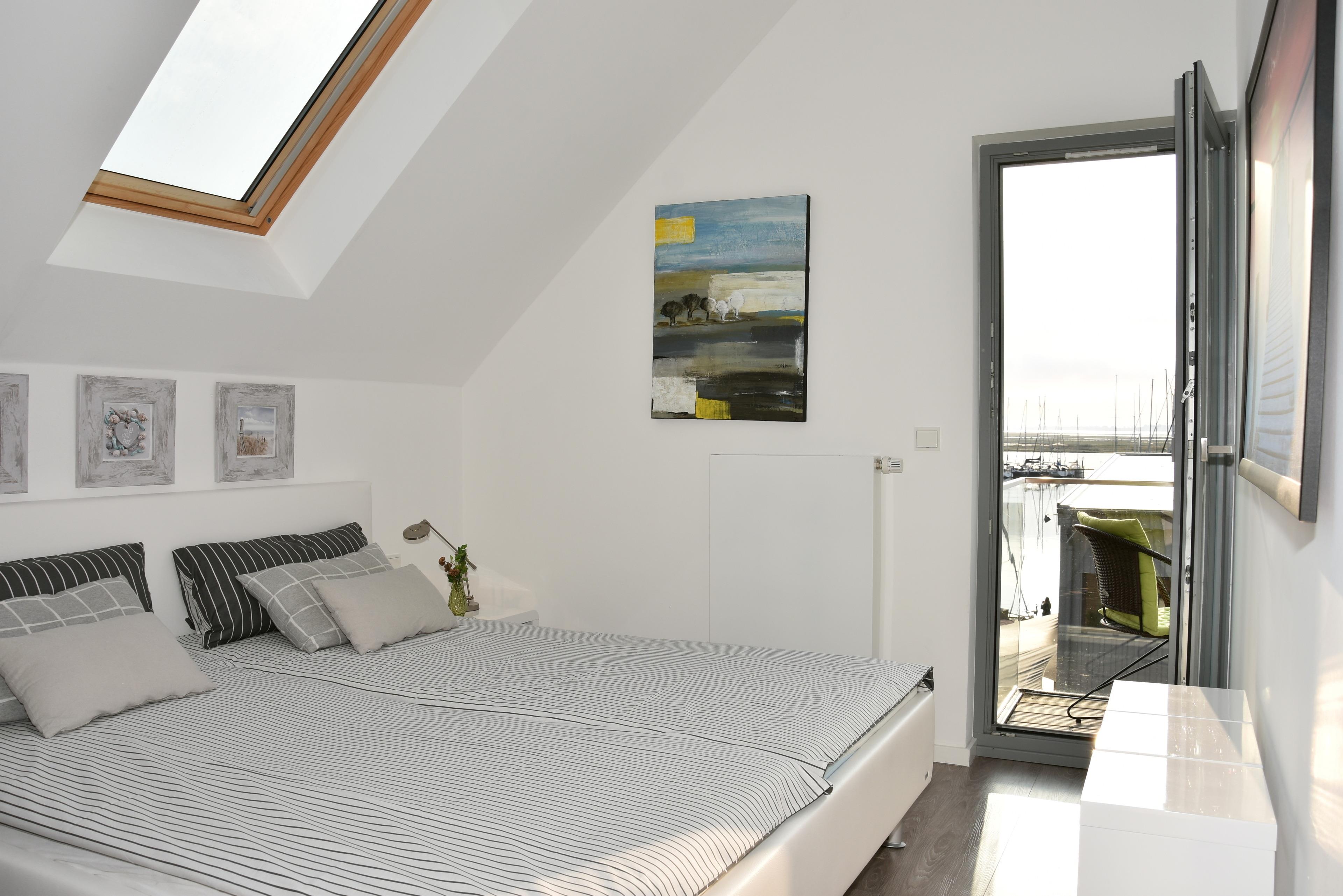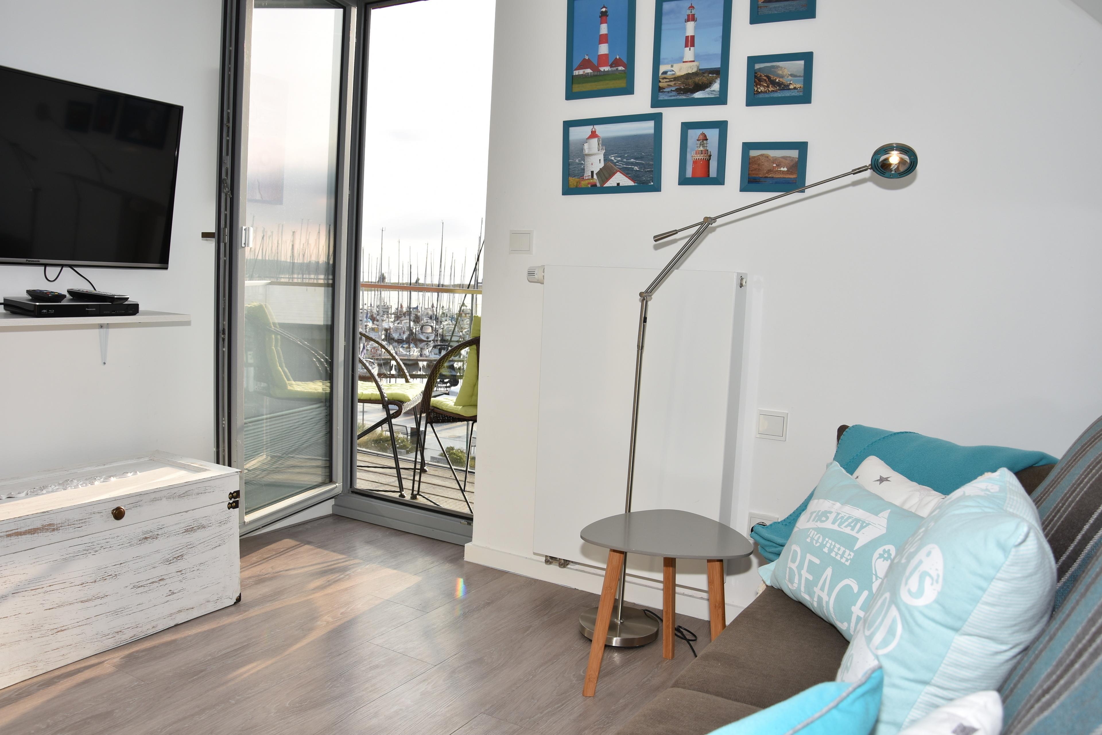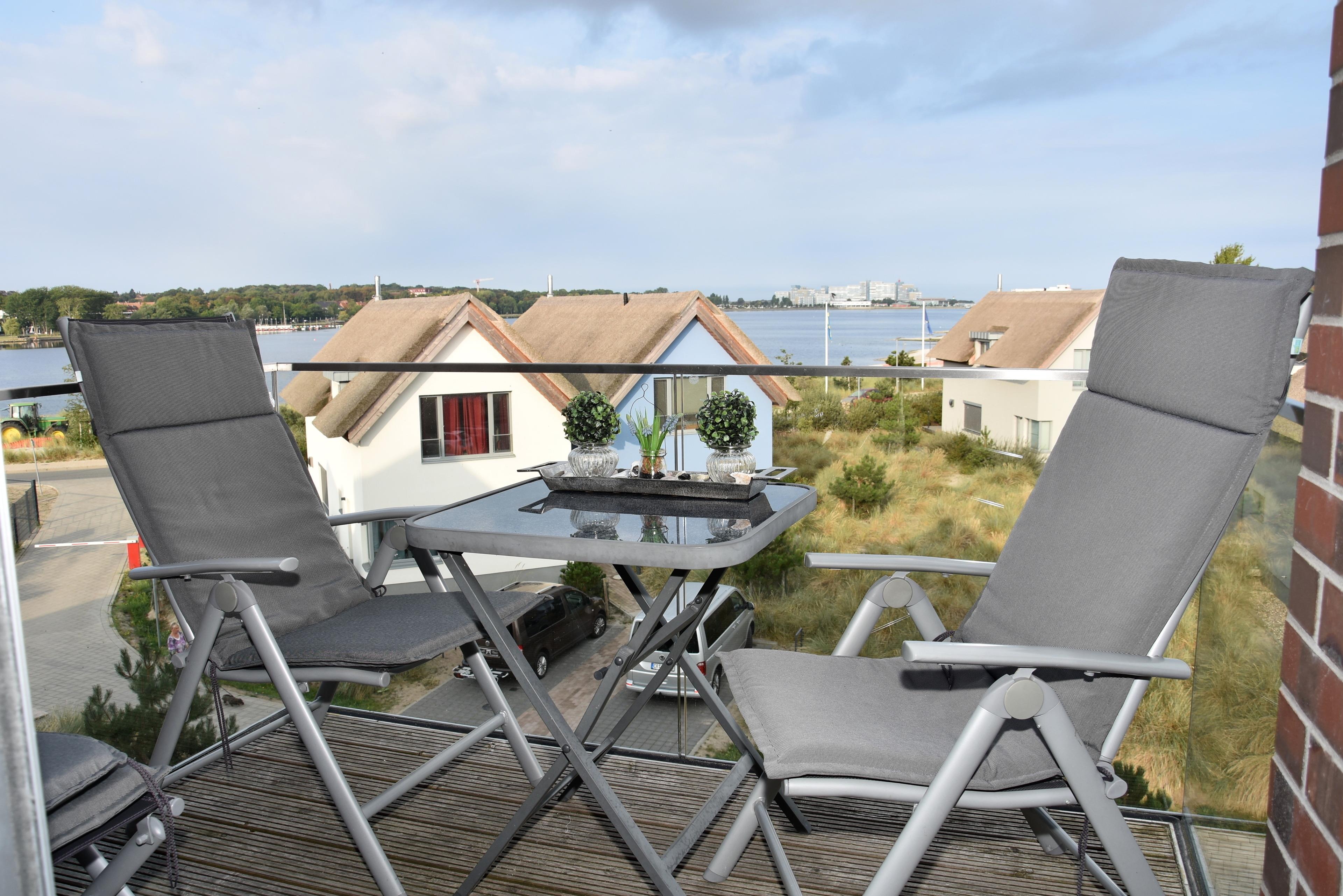 Vom Balkon der Schlafzimmer aus haben Sie einen herrlichen Blick über den Yachthafen, Graswarder (Naturschutzgebiet) und zur Ostsee.