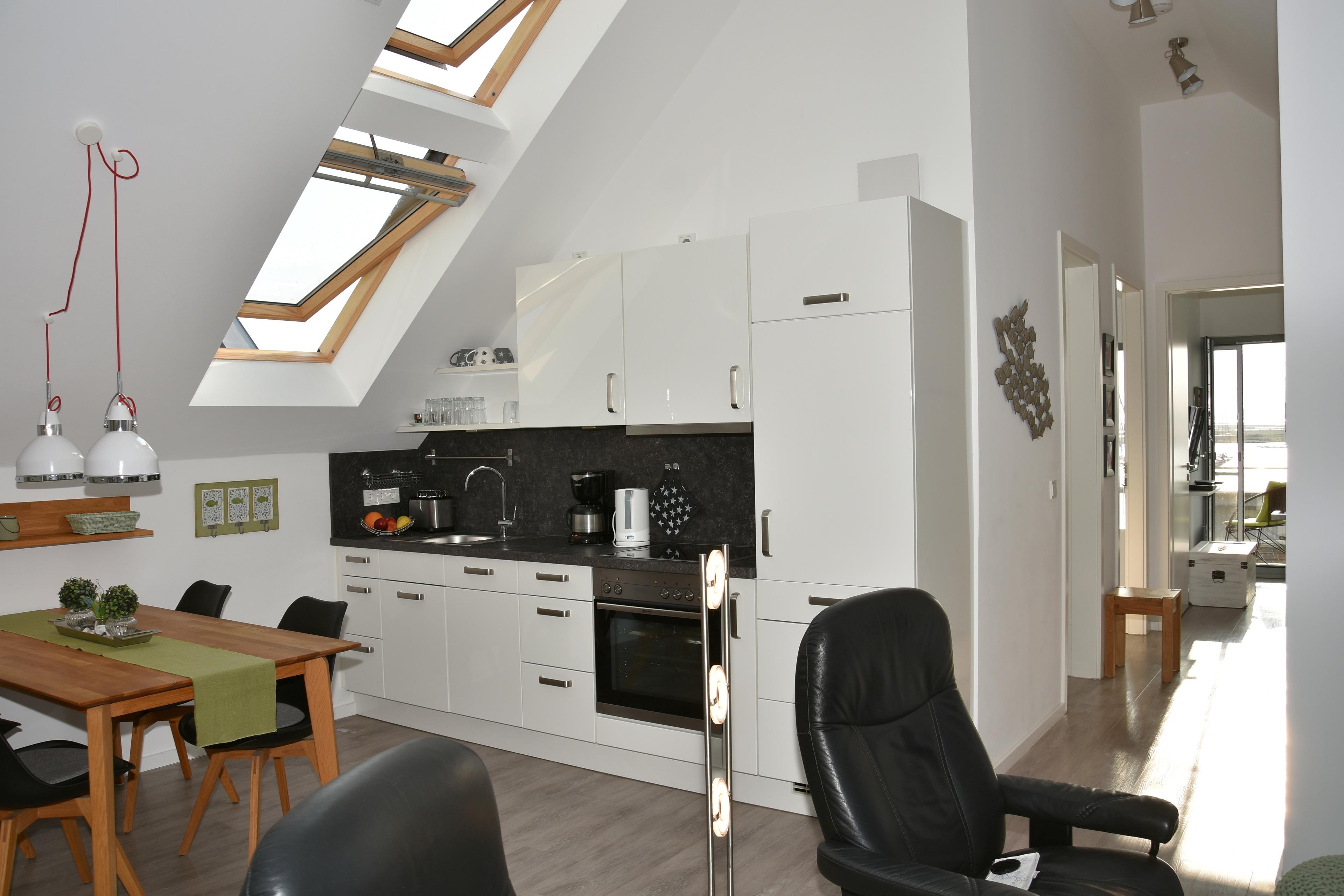 Der Wohn-Essbereich ist mit einer hochwertigen Einbauküche ausgestattet. (Elektroherd mit Backofen, Geschirrspüler, Kühlschrank mit Gefrierfach und reichhaltiges Ess- und Kochgeschirr.)