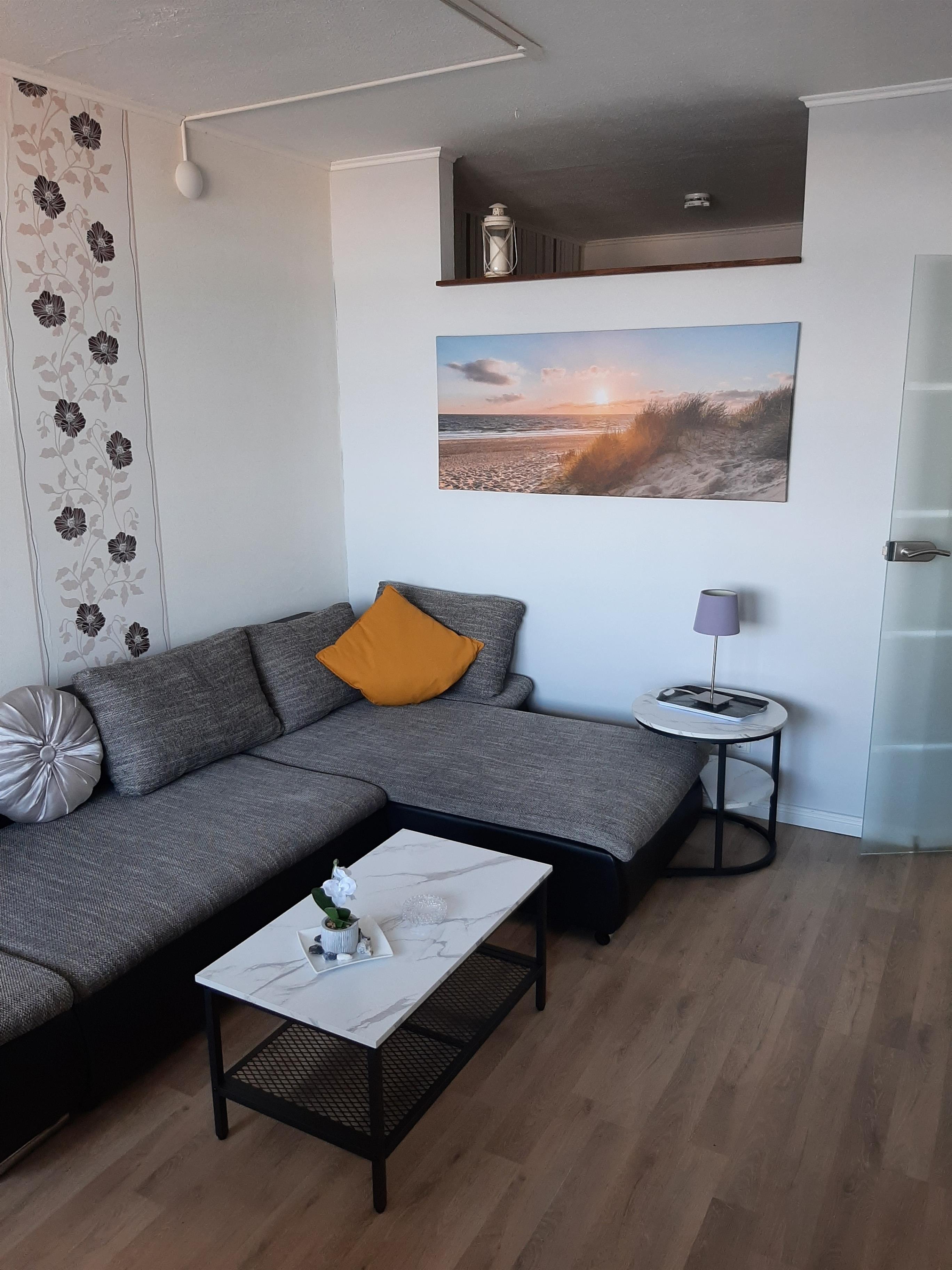 Wohn/Esszimmer Das WZ ist mit einer neuen grauen Couchgarnitur (auch als Schlafcouch), Couchtisch, Sideboard, 81cm LCD-TV//Stereo-Musikturm m. Bluetooth/True Wireless/USB/SD-Anschluss, FM-Radio sowie WLAN ausgestattet. Einige Bücher vorhanden.