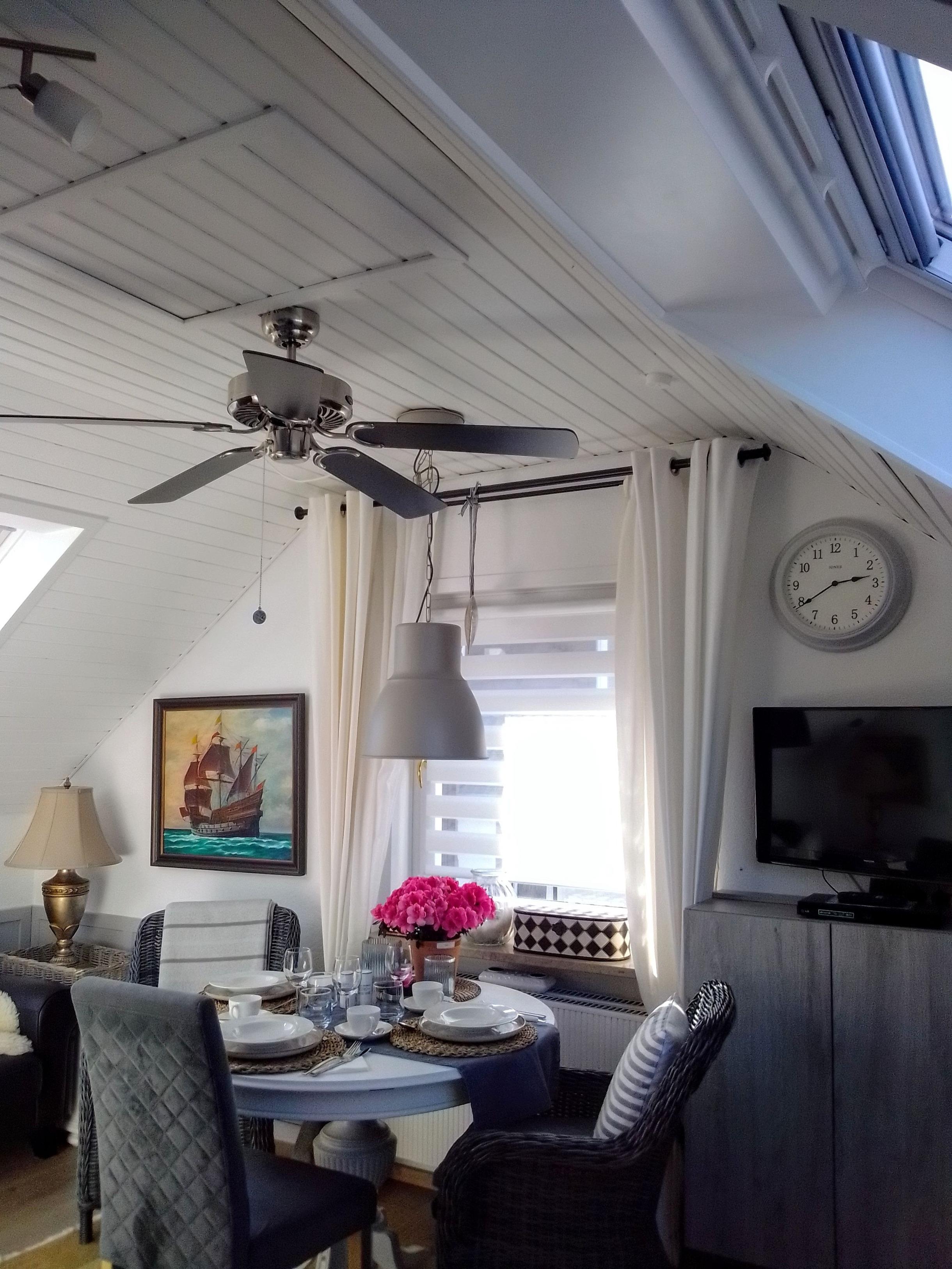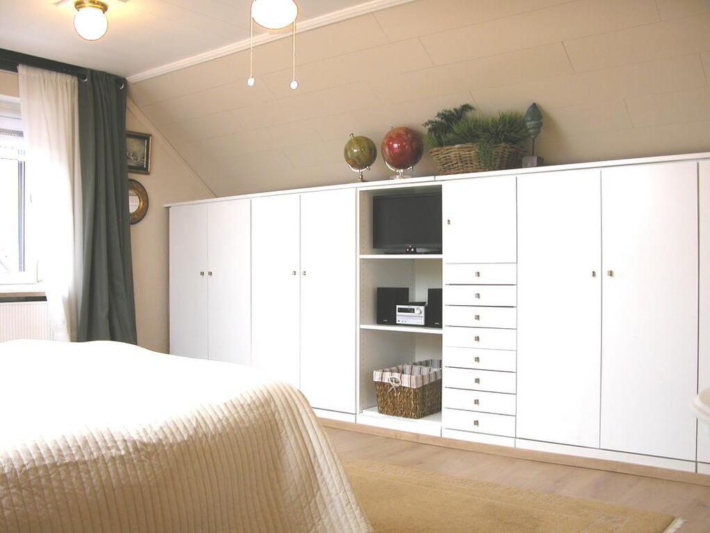 Das separate Schlafzimmer mit elektrischen Lattenrosten, elektrisches Veluxfenster, Rolläden, erhöhten Bettrahmen,2 XL-Bettdecken (im Winter mit kuscheliger Winterbettwäsche von Mont Chalet) und genügend Kissen, von weich bis hart, je nach Bedarf, bieten guten Schlafkomfort. Auch die anderen Räume verfügen über Rollladen oder blickdichte Rollos in den Schrägen. Alles kann stockdunkel sein, wenn Sie mögen. Bademäntel und Fön, sowie für Wolldecken und Wärmeflasche/n im Winter, oder an kühlen Abenden ist ausreichend gesorgt. Die Wohnung ist mit einer Satellitenempfangsanlage, Internetzugang sowie mit zwei Fernsehern und einer Musikanlage ausgestattet. Das sonnige Quarterdeck (Freisitz), ebenfalls Nichtraucherzone, lädt auch noch in den Abendstunden zum ungestörten Grillen ein.