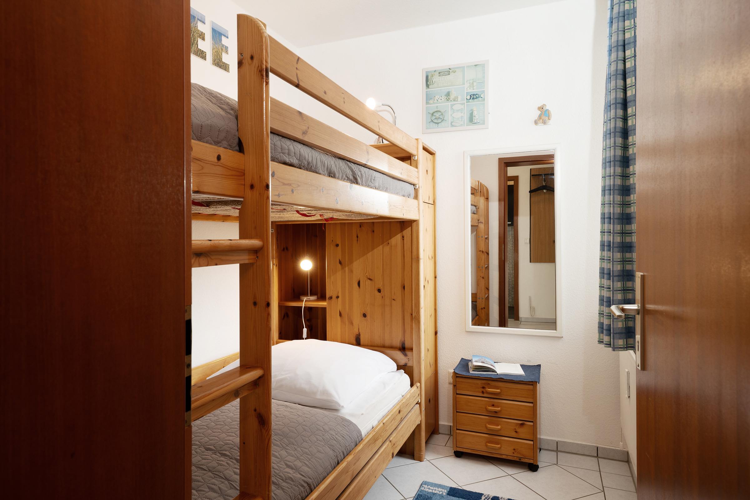 Schlafzimmer 2: 1 Etagenbett (2x 90x200 cm), Verdunkelung: Jalousien, Platz für ein Babybett vorhanden