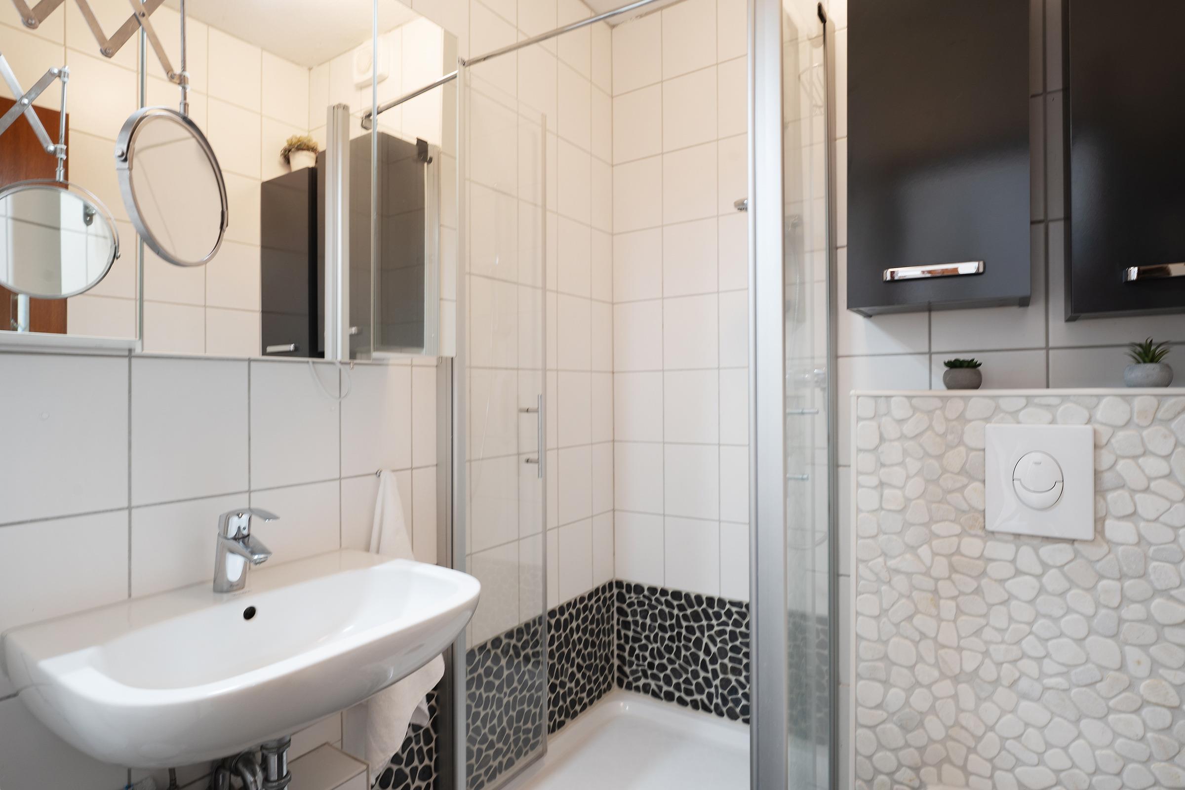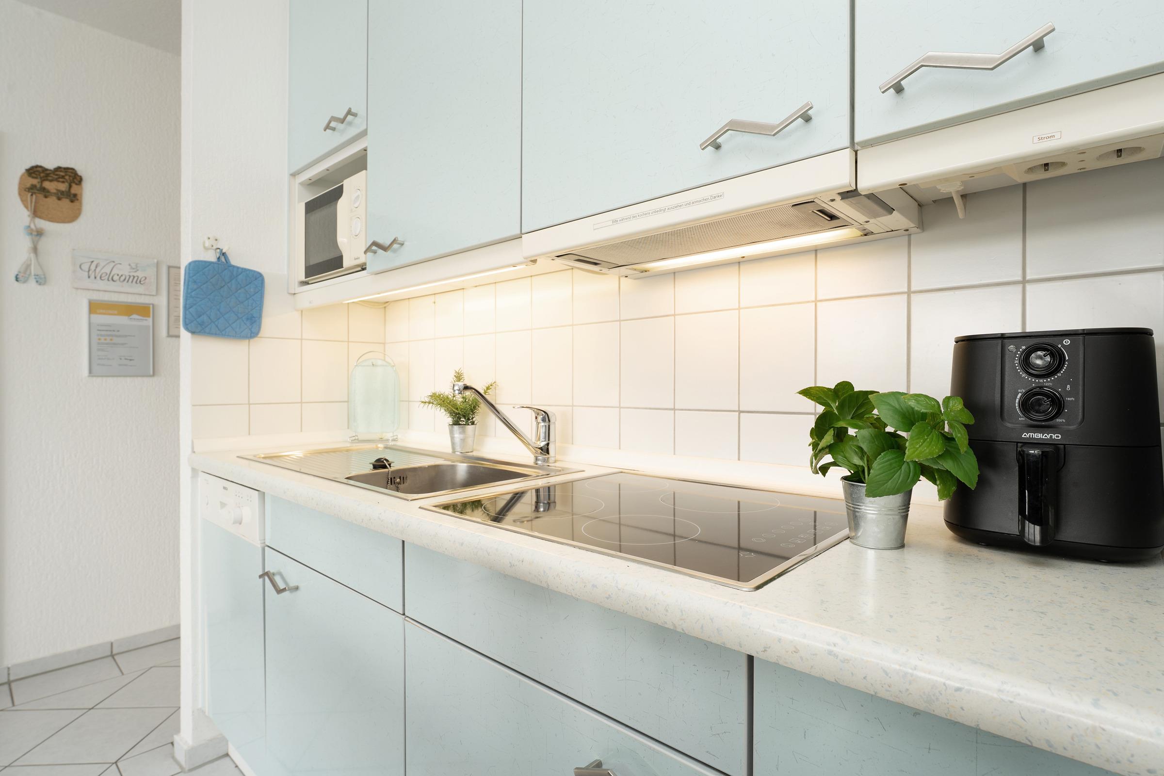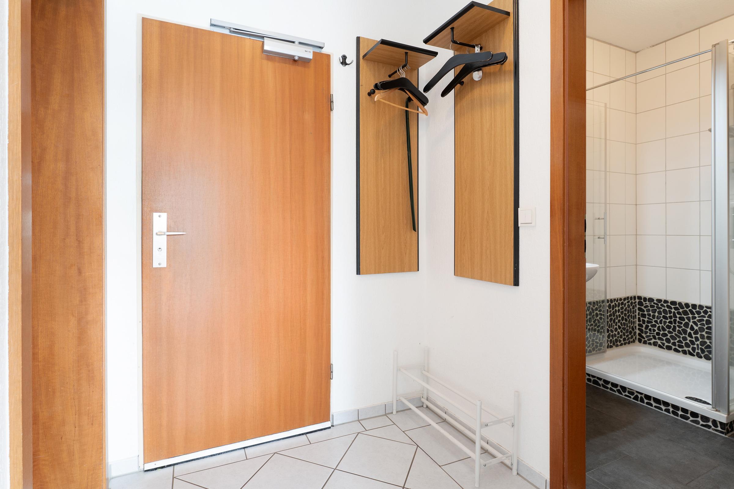 Diese charmante Ferienwohnung empfängt Sie mit einem gemütlichen Wohnbereich, ausgestattet mit einem Fernseher, Radio und einer bequemen Sitzlandschaft, die zum Entspannen nach einem erlebnisreichen Urlaubstag einlädt. Vom Wohnraum aus gelangen Sie auf den Süd-Balkon mit Elektrogrill – hier lassen sich Mahlzeiten unter freiem Himmel genießen. Die moderne Küchenzeile ist mit einem 4-Platten-Cerankochfeld, Backofen, Geschirrspüler, Mikrowelle, Kühlschrank mit Gefrierfach, Kaffeemaschine, sowie Wasserkocher und Toaster voll ausgestattet. Der angrenzende Essbereich bietet ausreichend Platz für gesellige Runden. Das erste Schlafzimmer verfügt über ein komfortables Doppelbett und einen Fernseher, das zweite über ein Etagenbett – ideal für Familien. Im Badezimmer befindet sich eine Dusche mit flachem Einstieg (12 cm) sowie ein WC.