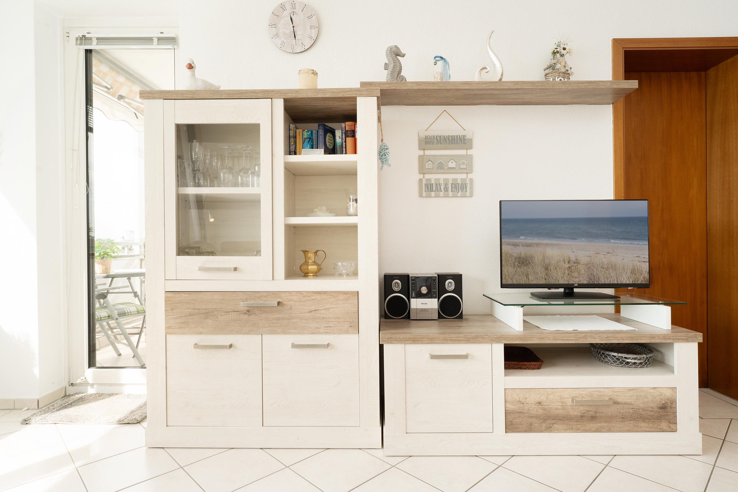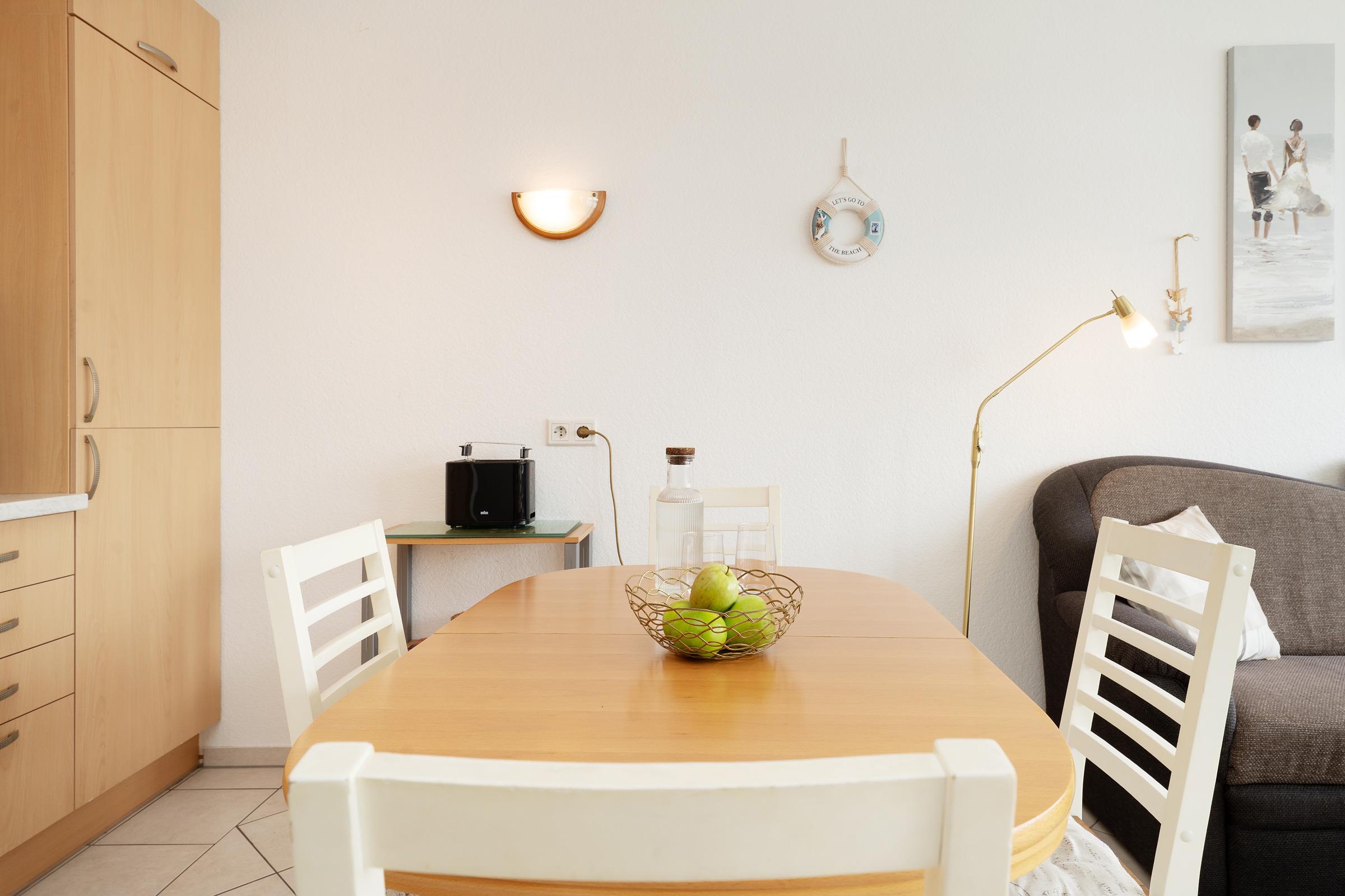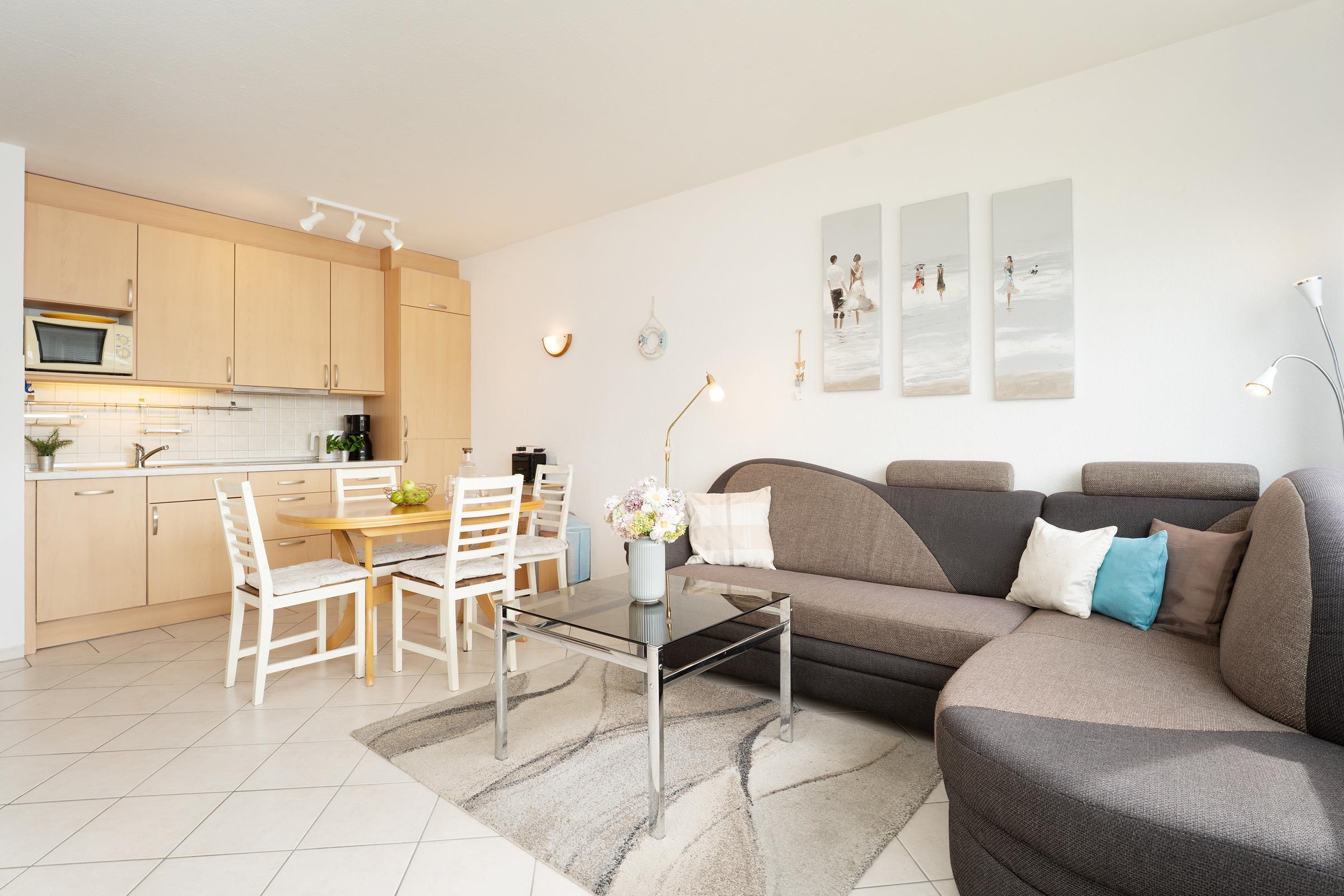 Freuen Sie sich auf einen hellen Wohnbereich mit bequemer Sofaecke, Fernseher und Radio – perfekt für entspannte Stunden. Direkt vom Wohnraum betreten Sie den sonnigen Südbalkon mit Outdoormöbeln ausgestattet, der zum Essen im Freien einlädt. Die voll ausgestattete Küchenzeile verfügt über ein 4-Platten-Cerankochfeld, Backofen, Mikrowelle, Kühlschrank mit Gefrierfach, Geschirrspüler, Kaffeemaschine, Wasserkocher und Toaster. Im angrenzenden Essbereich finden alle Gäste bequem Platz. Das Hauptschlafzimmer bietet ein Doppelbett und einen weiteren Fernseher, im zweiten Schlafzimmer sorgt ein Etagenbett für kindgerechte Schlafplätze. Das Bad verfügt über Dusche mit flachem Einstieg (33 cm) und WC.