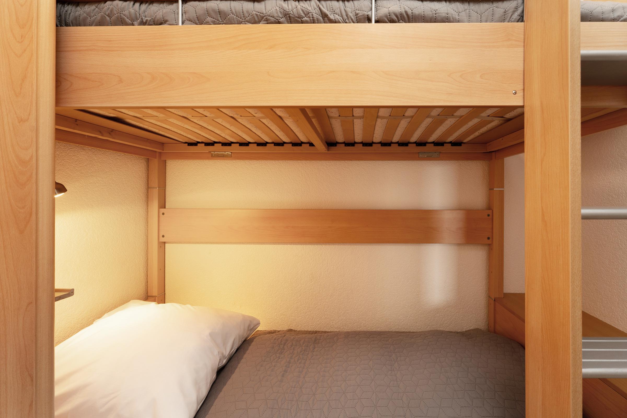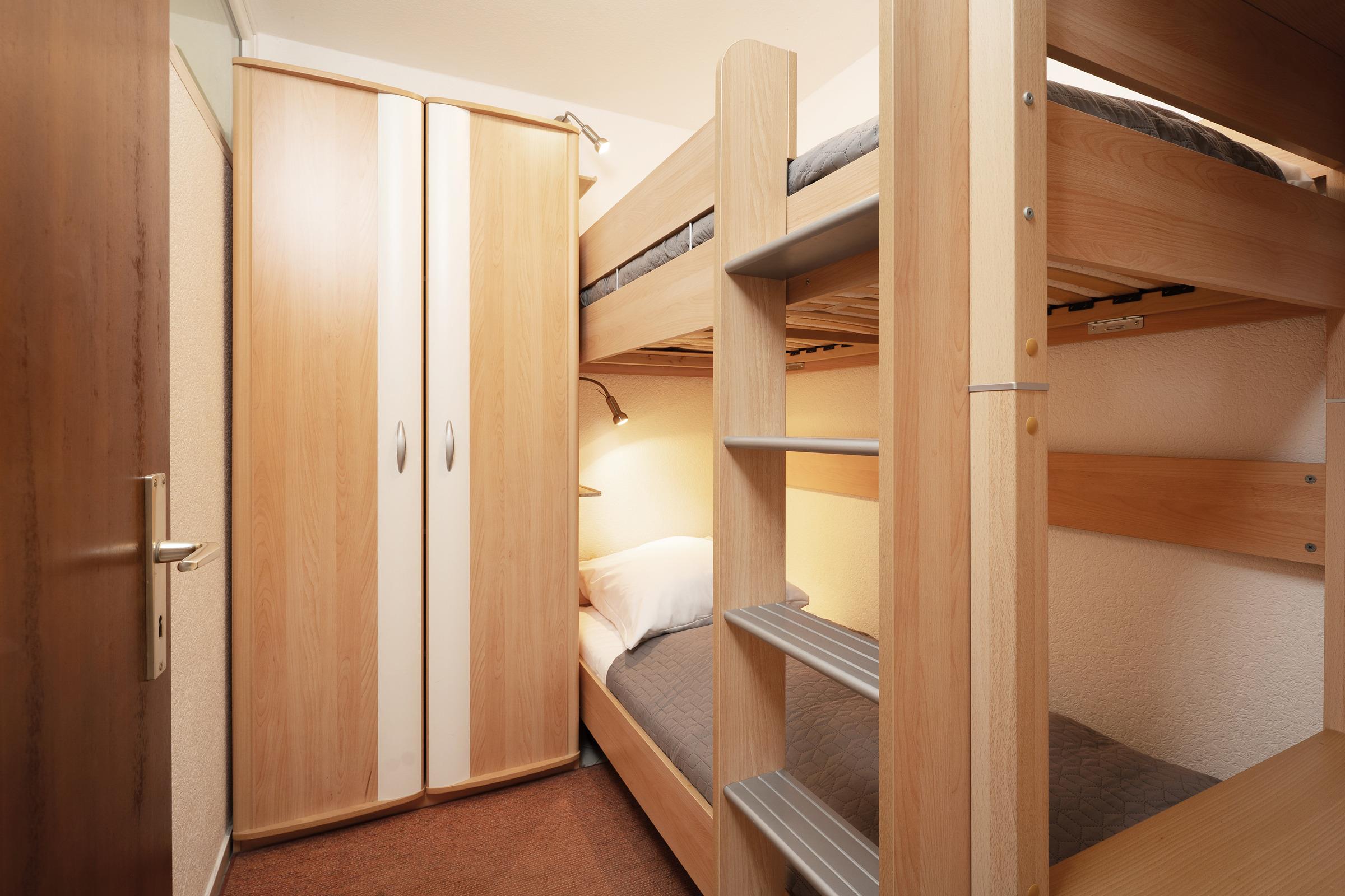 Schlafzimmer 2: 1 Etagenbett (2x 90x200 cm), Kleiderschrank, Oberlichtfenster zum Schlafzimmer, keine Verdunkelung, Platz für ein Babybett vorhanden