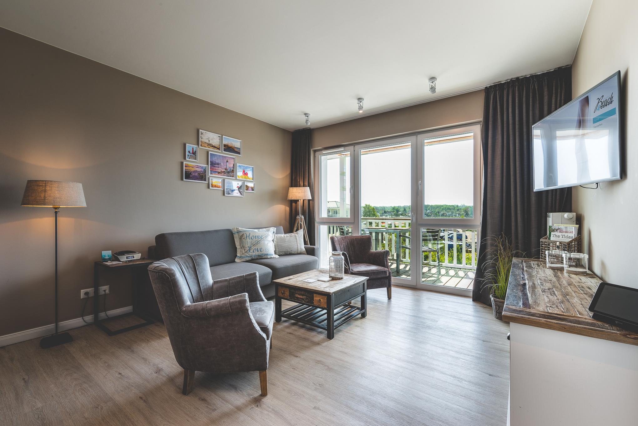 Das Apartment dieser Kategorie befindet sich in Erd- und Obergeschoss unserer freistehenden Häuser, eingebettet in die Dünen-Apartment-Landschaft des Beach Motel Geländes. Es ist über eine Außentreppe zu erreichen.