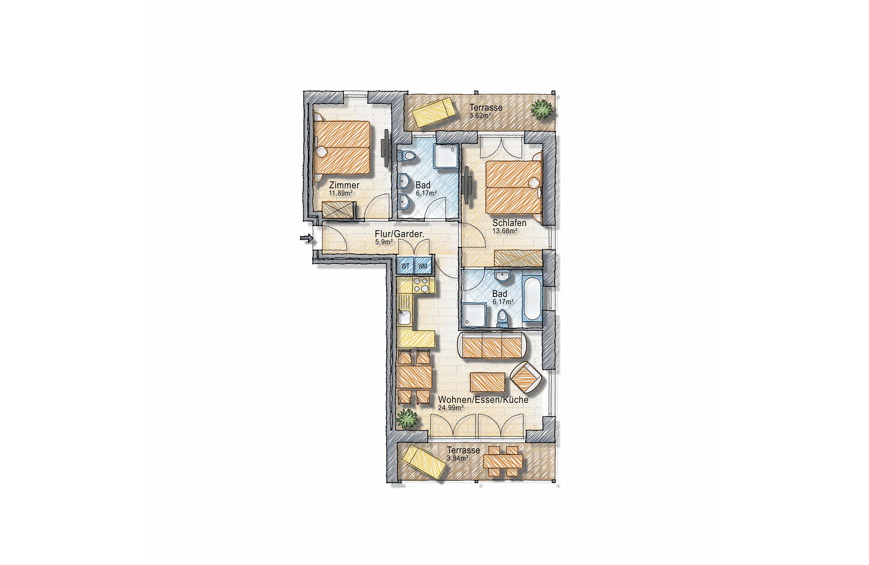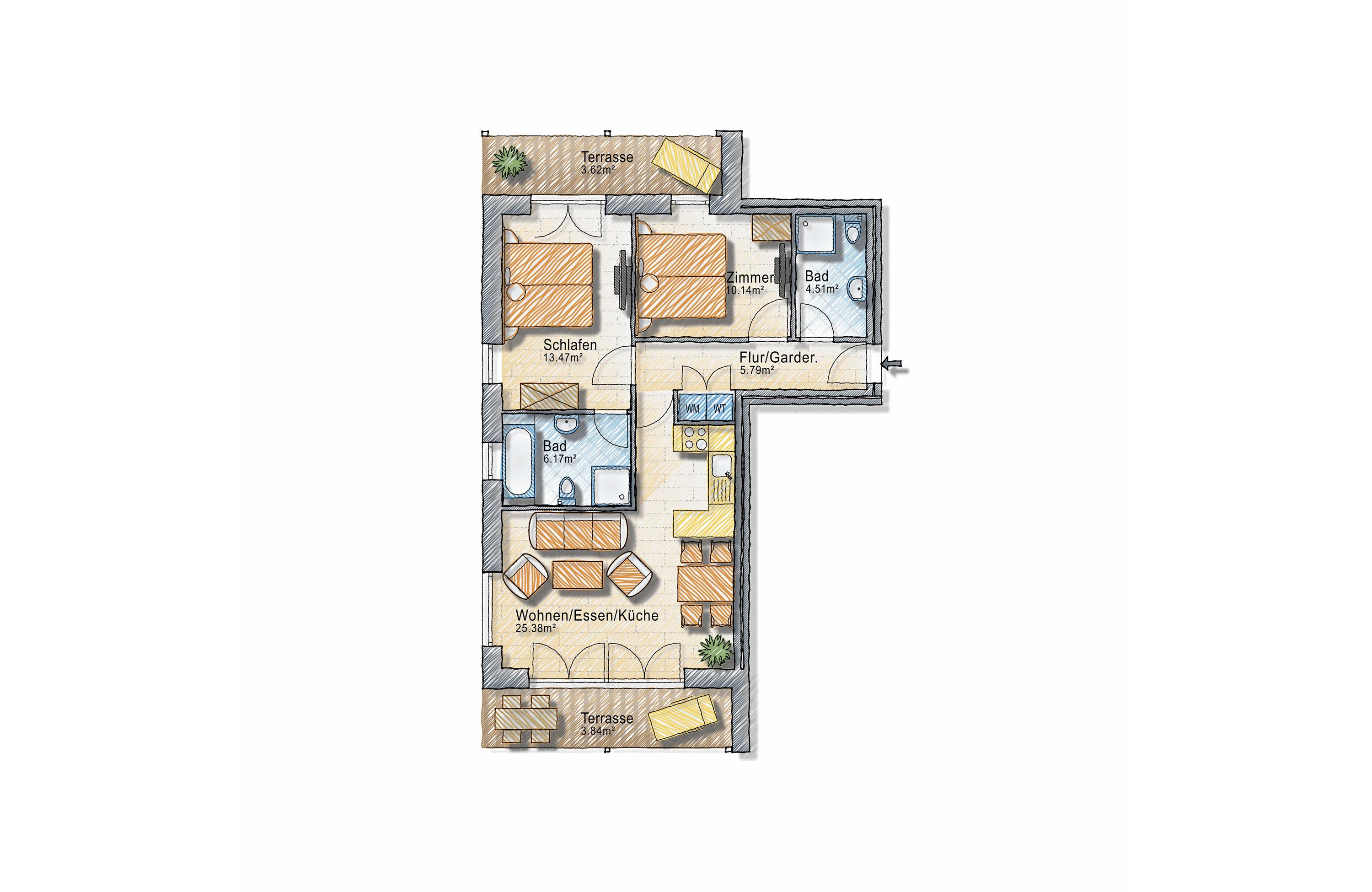 Auf 72 qm bleiben keine Wünsche offen: die großzügige Wohnküche mit Esstisch für vier Personen bietet Raum, um gemeinsam unvergessliche Urlaubsmomente zu schaffen – ob beim gemeinsamen Frühstück oder Dinner oder lieber gemütlich auf der Couch.