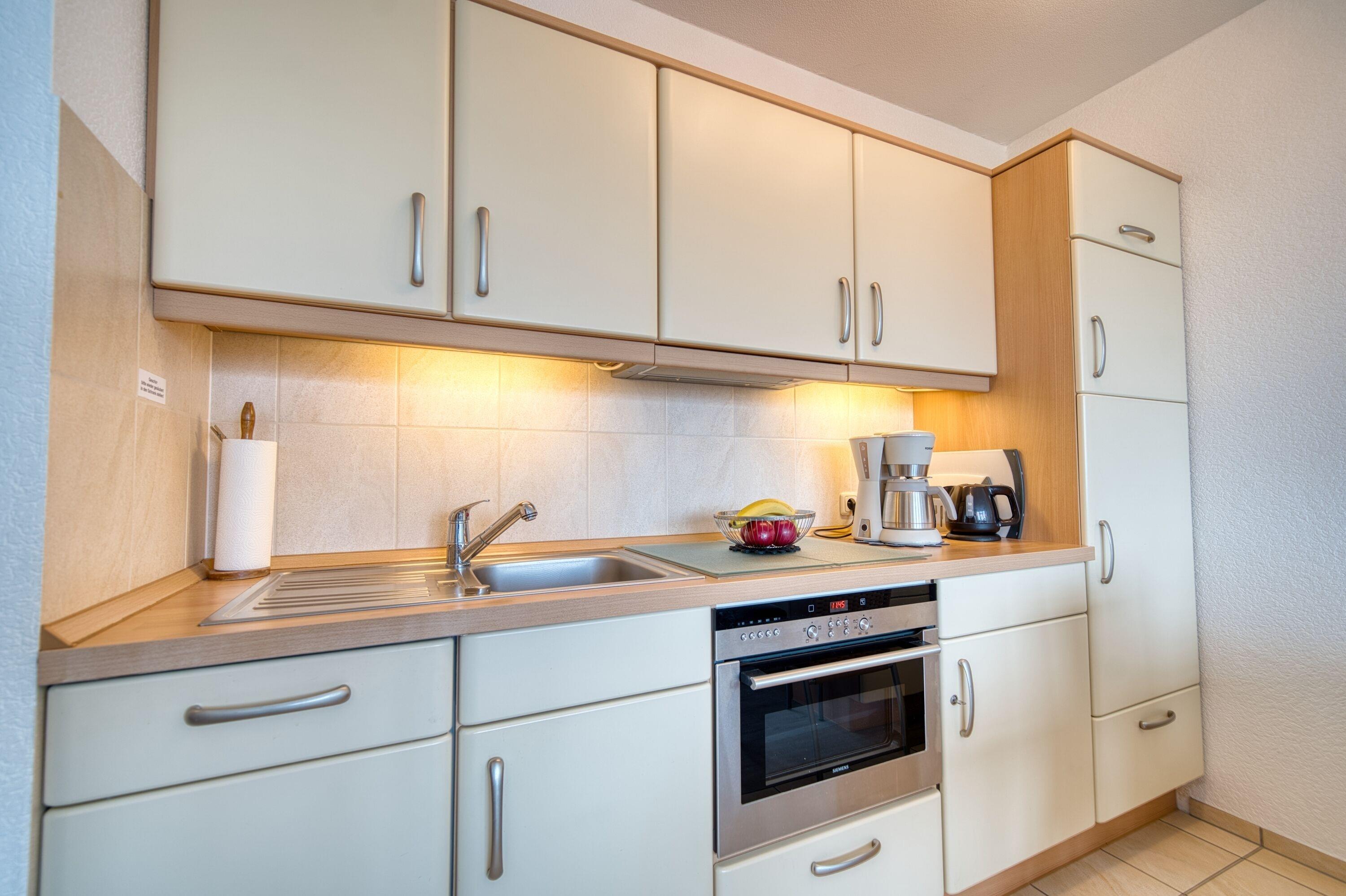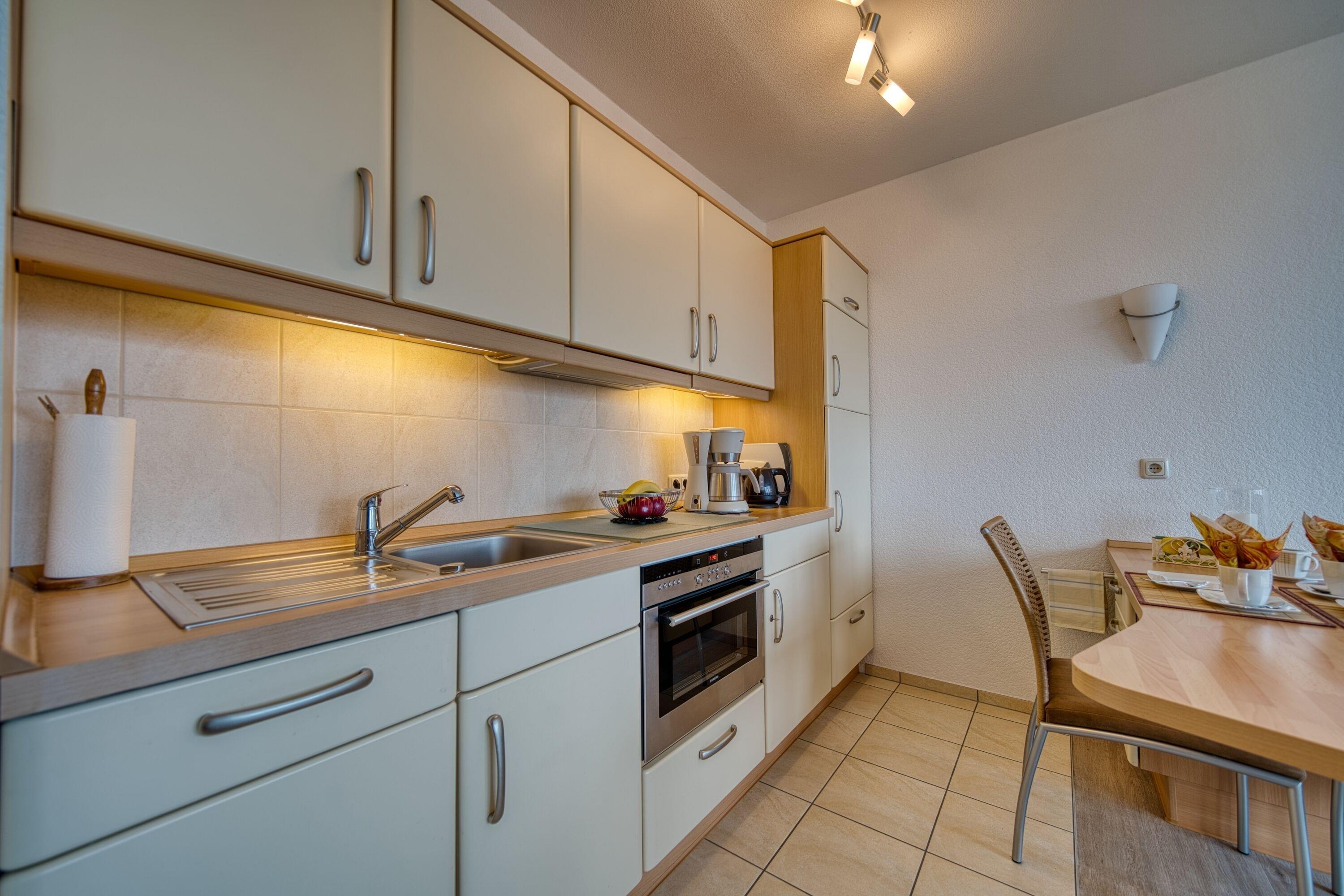 Küche: Voll ausgestattet mit Backofen inklusive Grillfunktion, Cerankochfeld, Kühlschrank mit Gefriermöglichkeit, Geschirrspüler, Toaster, Wasserkocher und Filterkaffeemaschine.