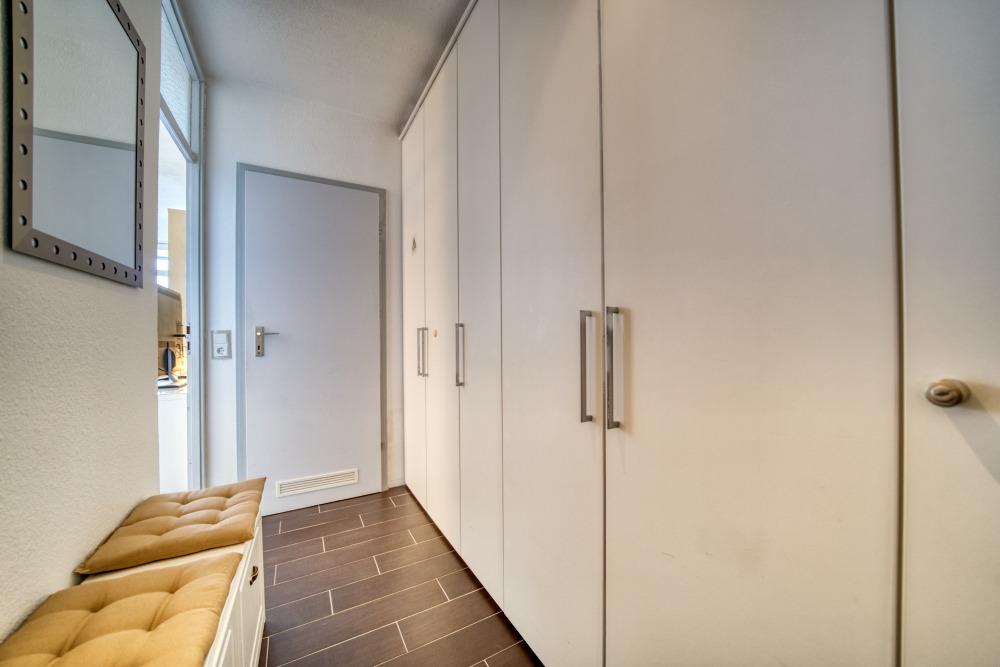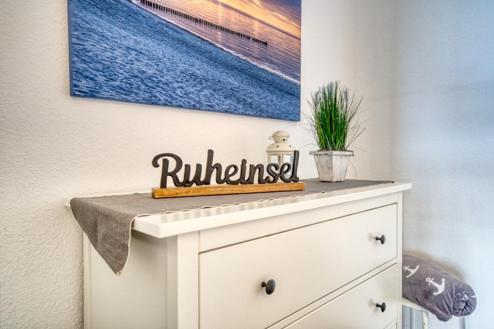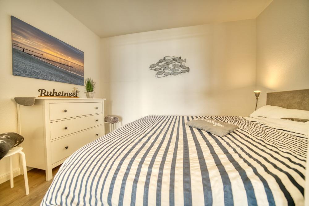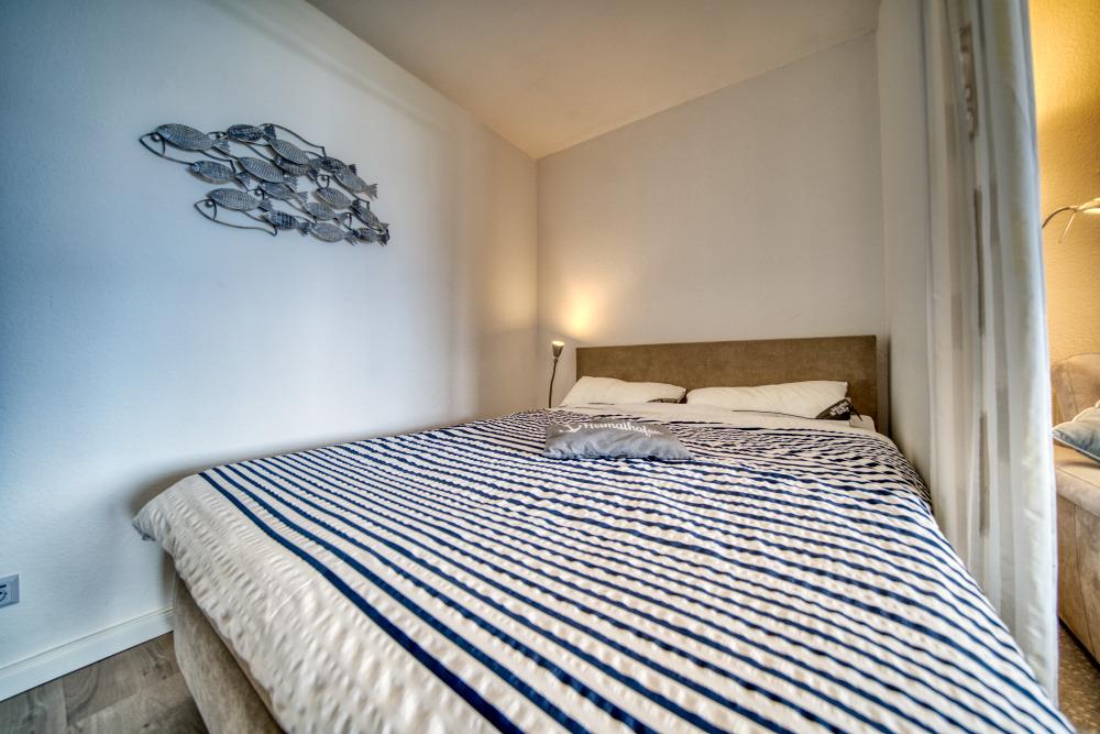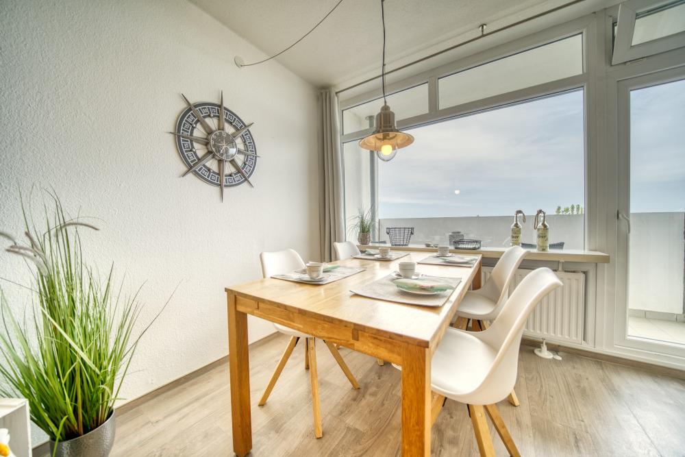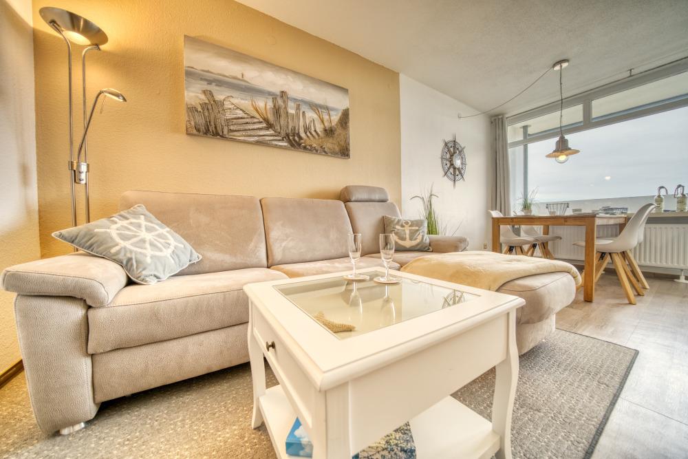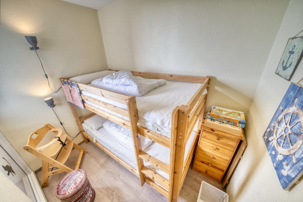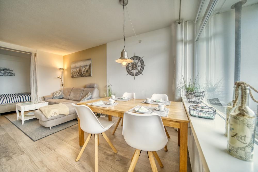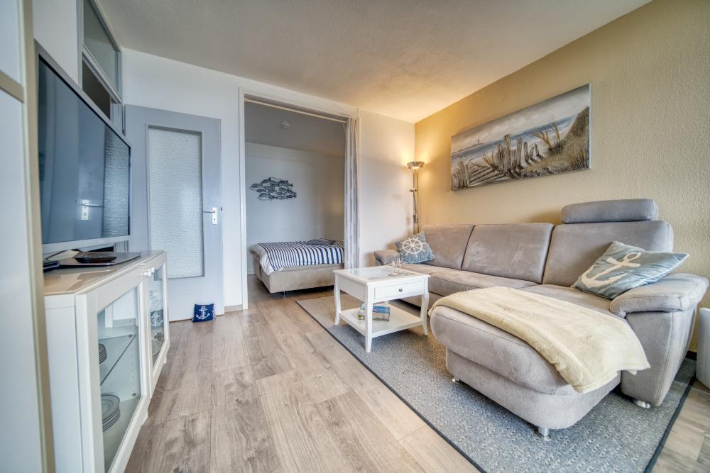 Die Wohnung verfügt über einen Schlafraum mit Boxspringbett (160x200 cm) sowie ein separates Schlafzimmer mit Etagenbett. Das Wohn-Esszimmer ist mit Ecksofa, Flachbild-TV und Esstisch ausgestattet und bietet direkten Zugang zum Balkon.