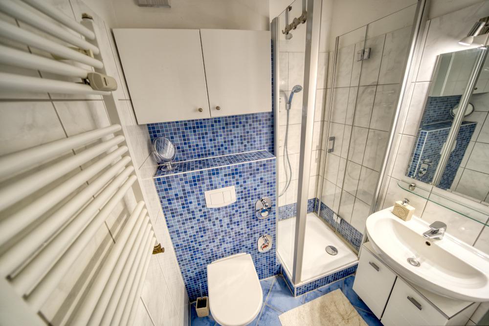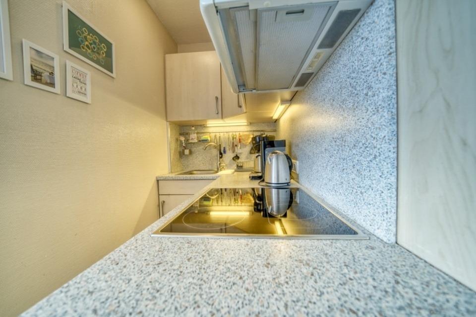 Die Küche ist eingerichtet mit Ceranherd, Backofen, Kühlschrank mit Gefrierfach, Mikrowelle, Filterkaffeemaschine und Wasserkocher. Das Badezimmer verfügt über Duschkabine, WC und Handtuchtrockner.