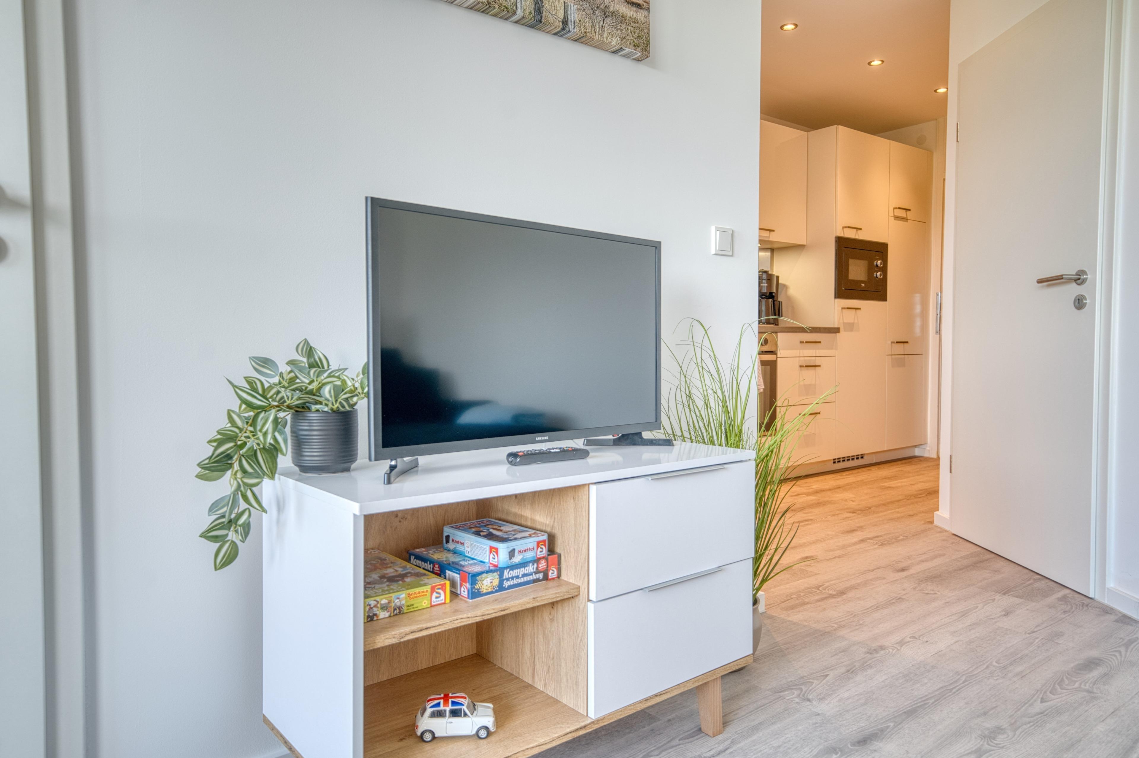 Im offenen Wohnbereich erwarten Sie eine bequeme Couch und ein Flachbildfernseher – perfekt zum Abschalten.