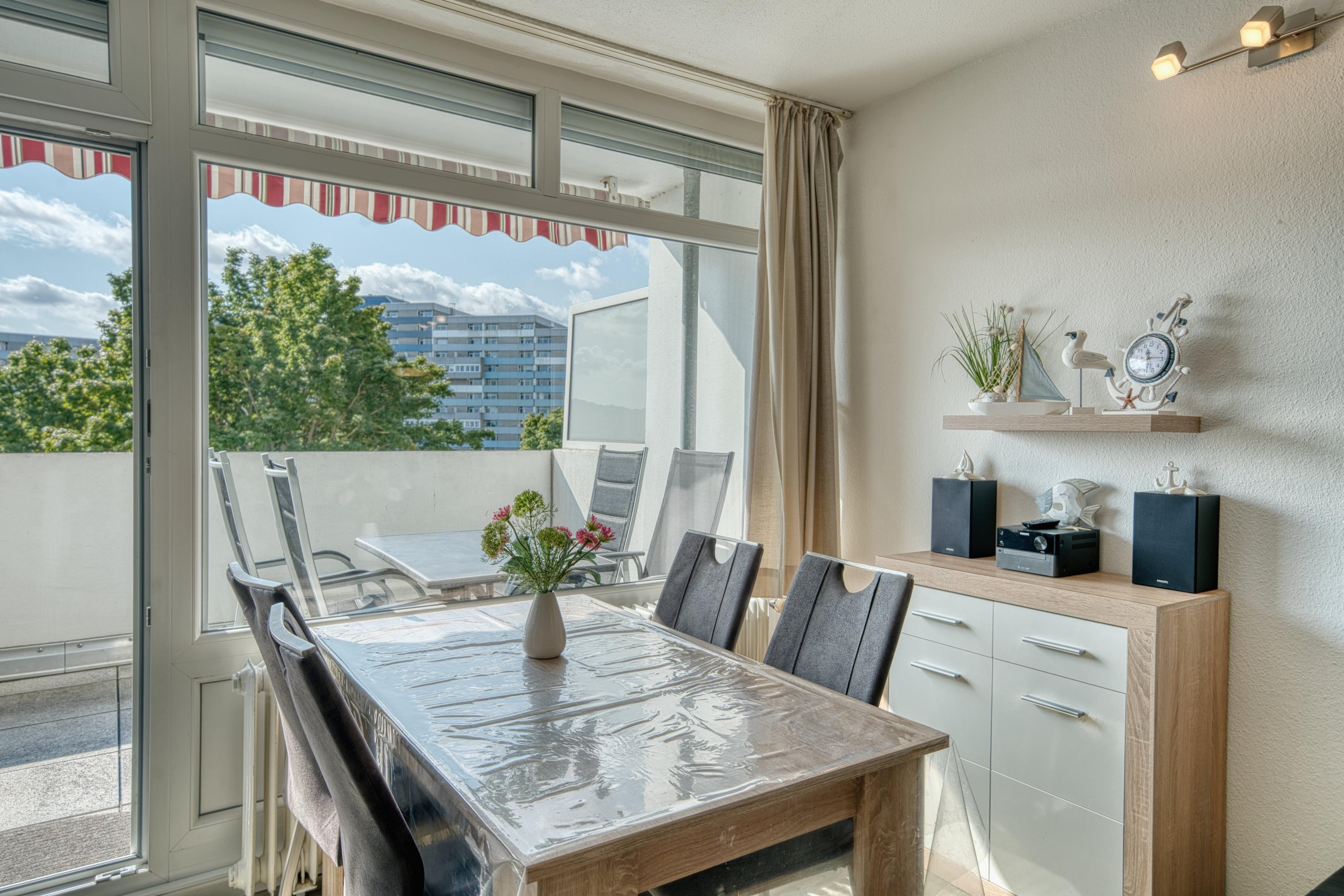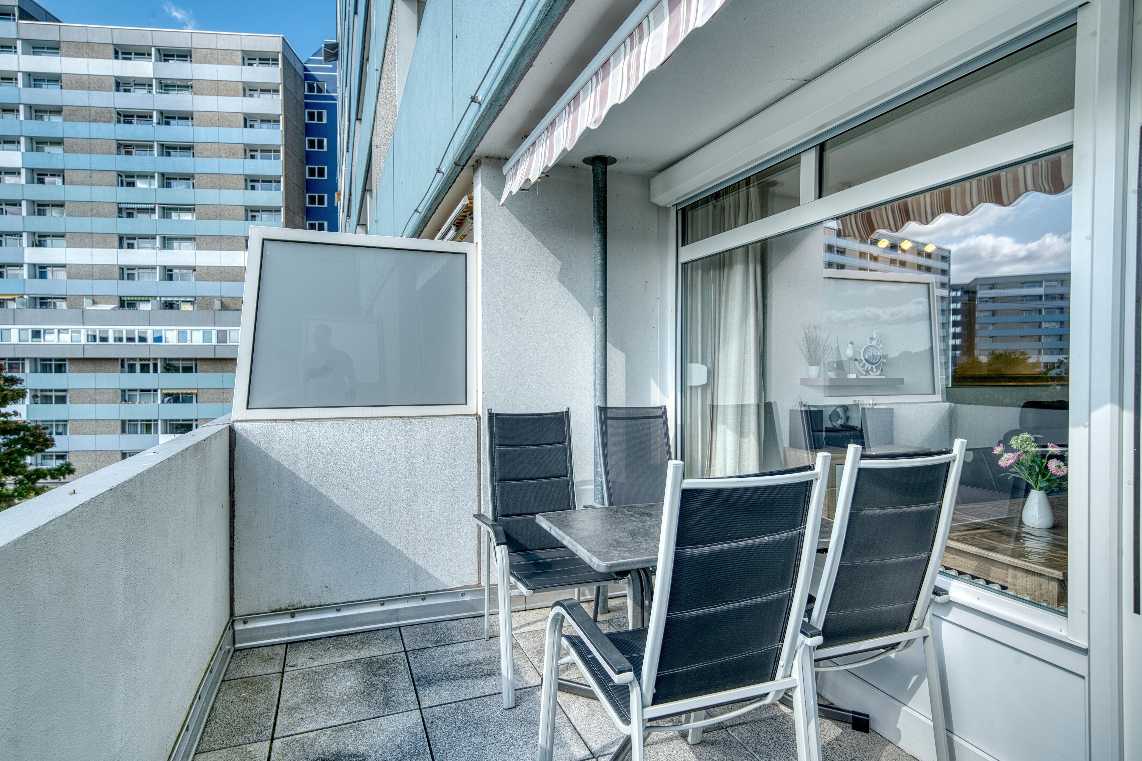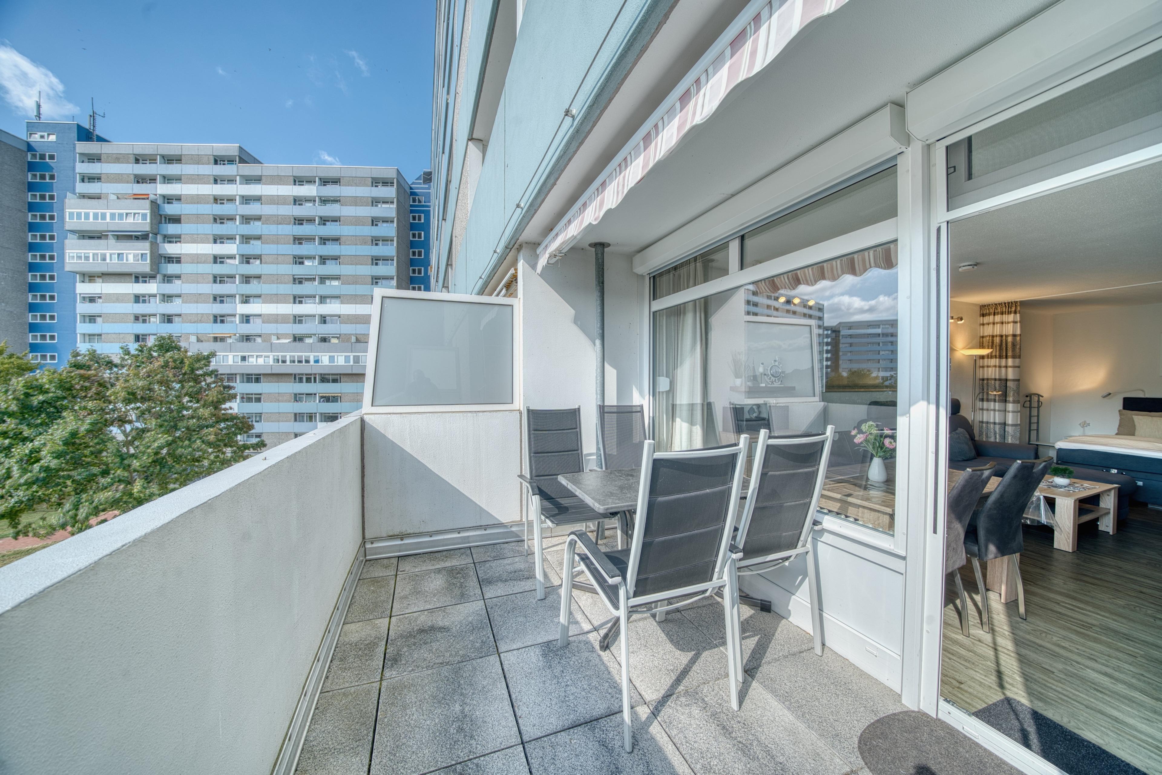 Die Wohnung befindet sich im Haus B des Ferienparks Heiligenhafen und wurde im Jahr 2019 renoviert. Sie liegt in der 3. Etage und bietet einen schönen Ausblick auf den Innenhof und den Binnensee. Besonders der extra große Balkon zur Südseite lädt dazu ein, die Sonne von morgens bis abends zu genießen. Der Balkon ist mit Gartenmöbeln und einer Markise ausgestattet.