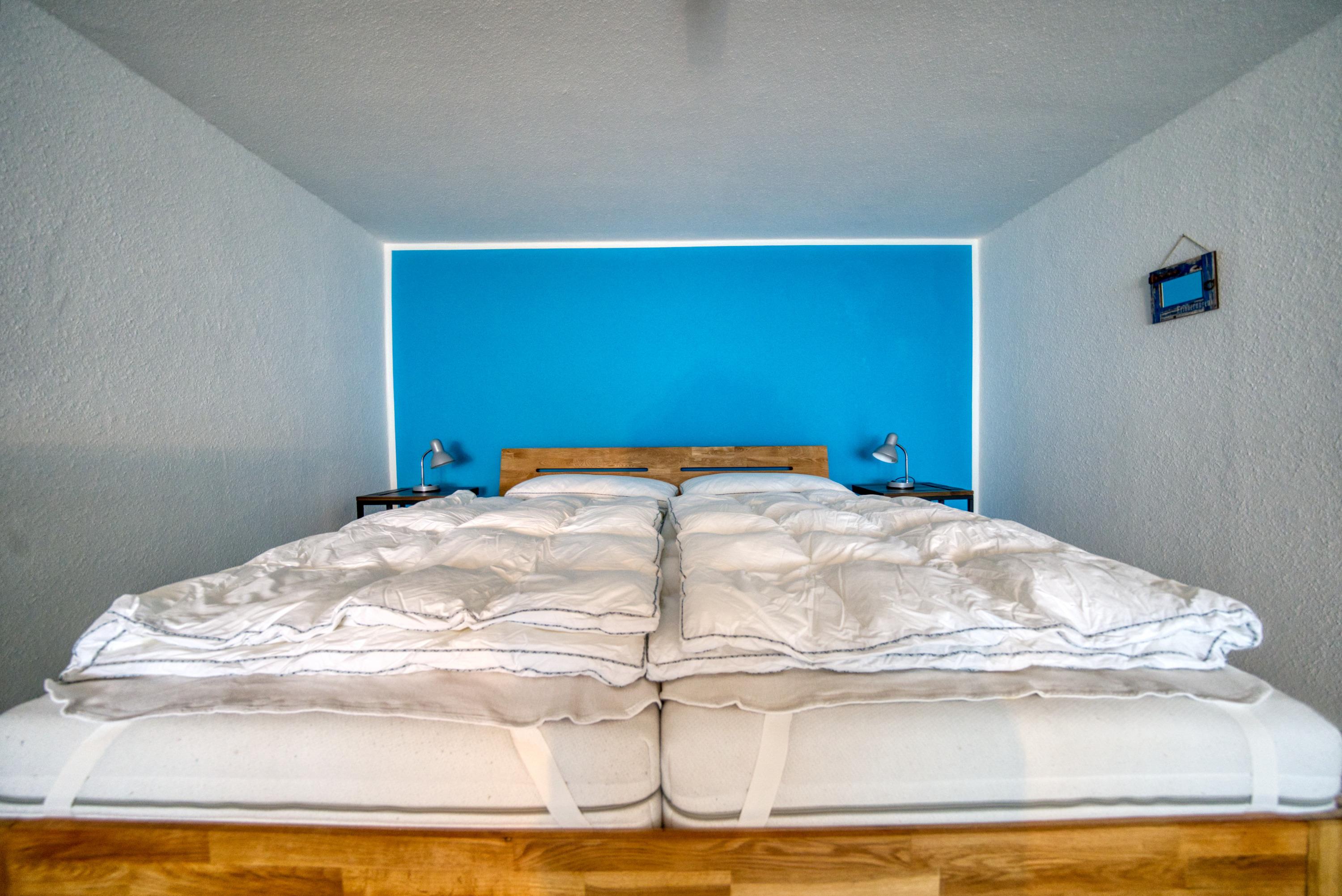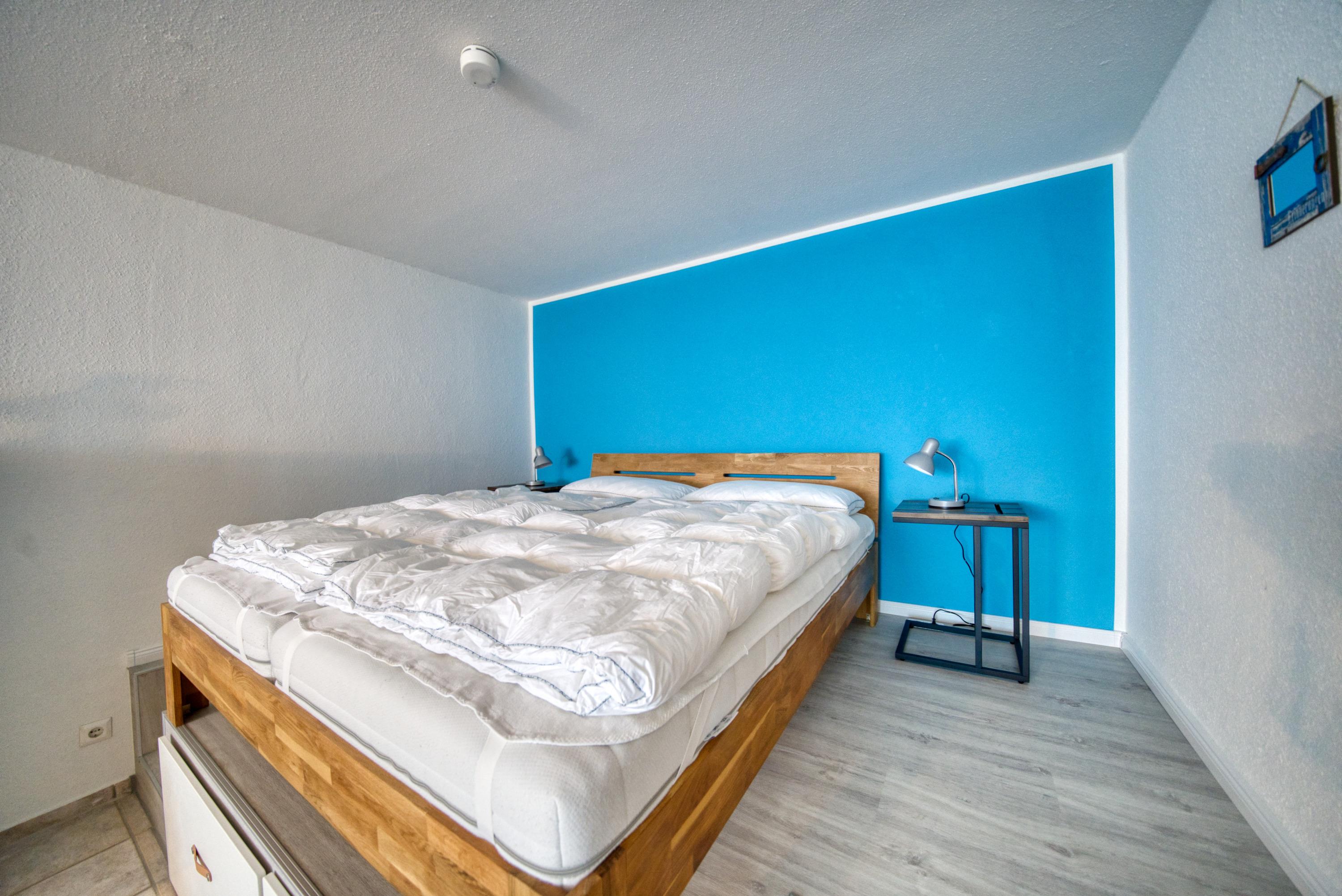 Wohn-Schlafbereich mit Doppelbett (erhöht auf einem Podest für Meeresblick beim Aufwachen)