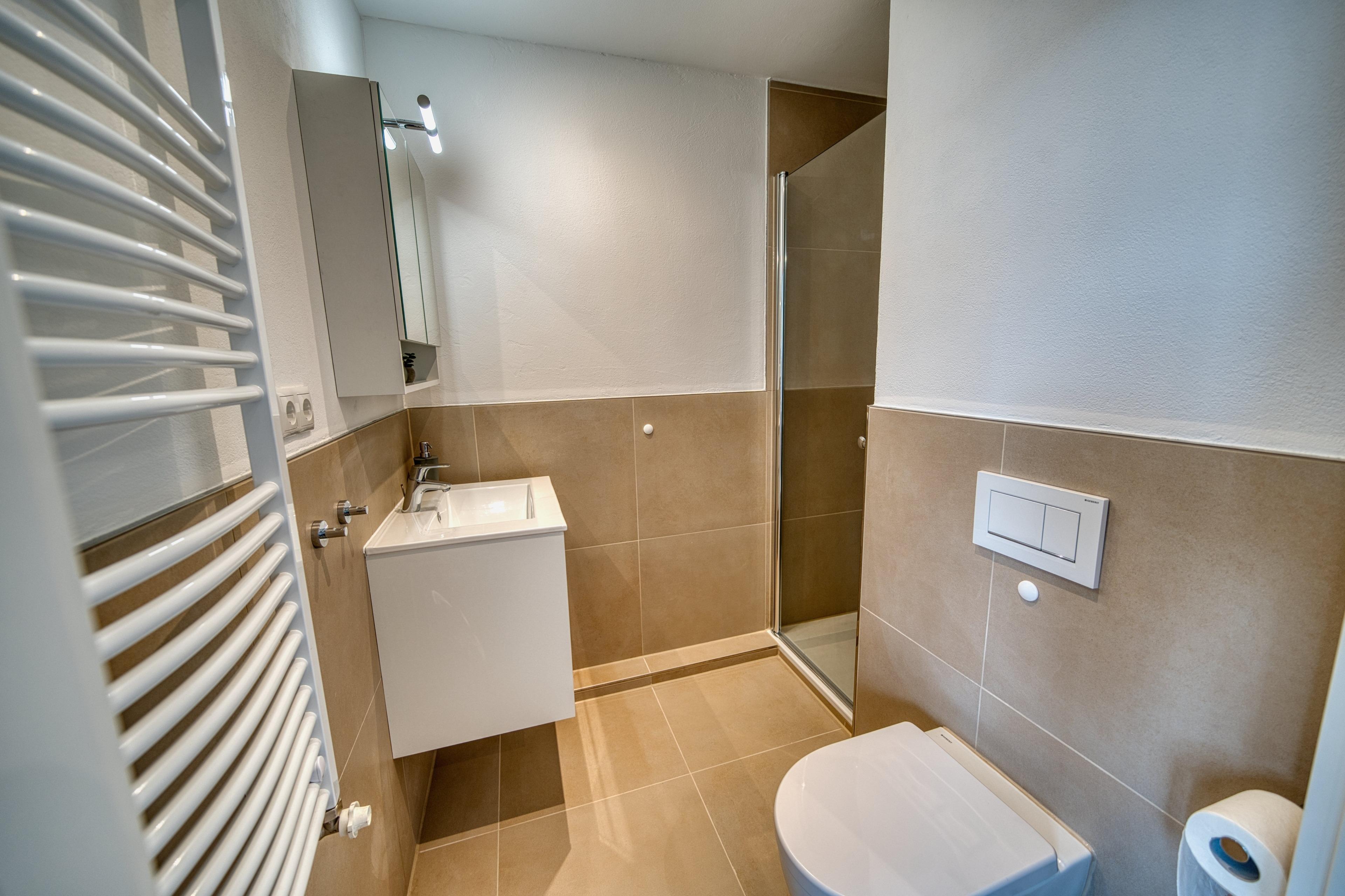 Bad: Das moderne Bad ist mit einer modernen Dusche ausgestattet – komfortabel für viele Altersgruppen.