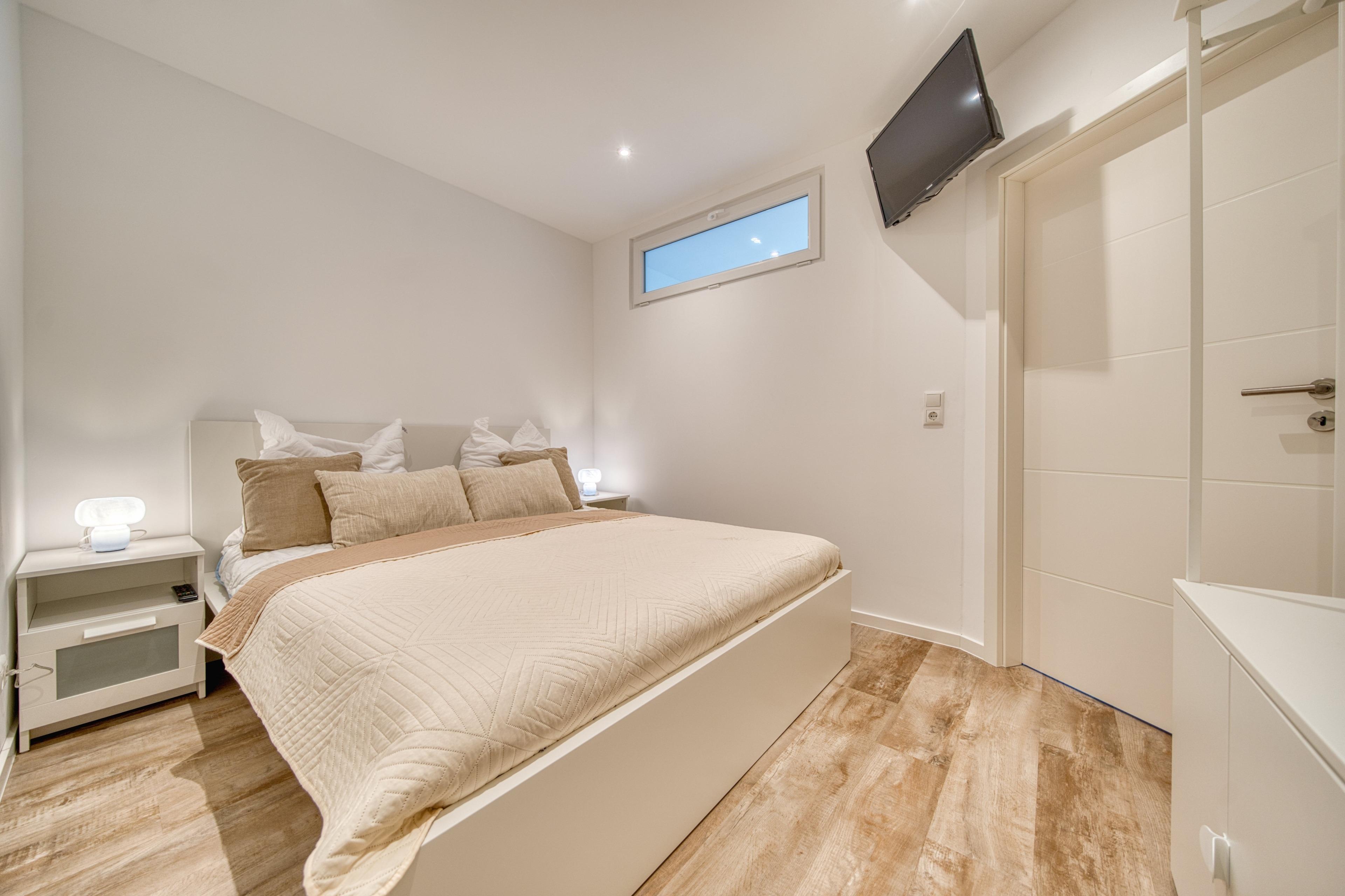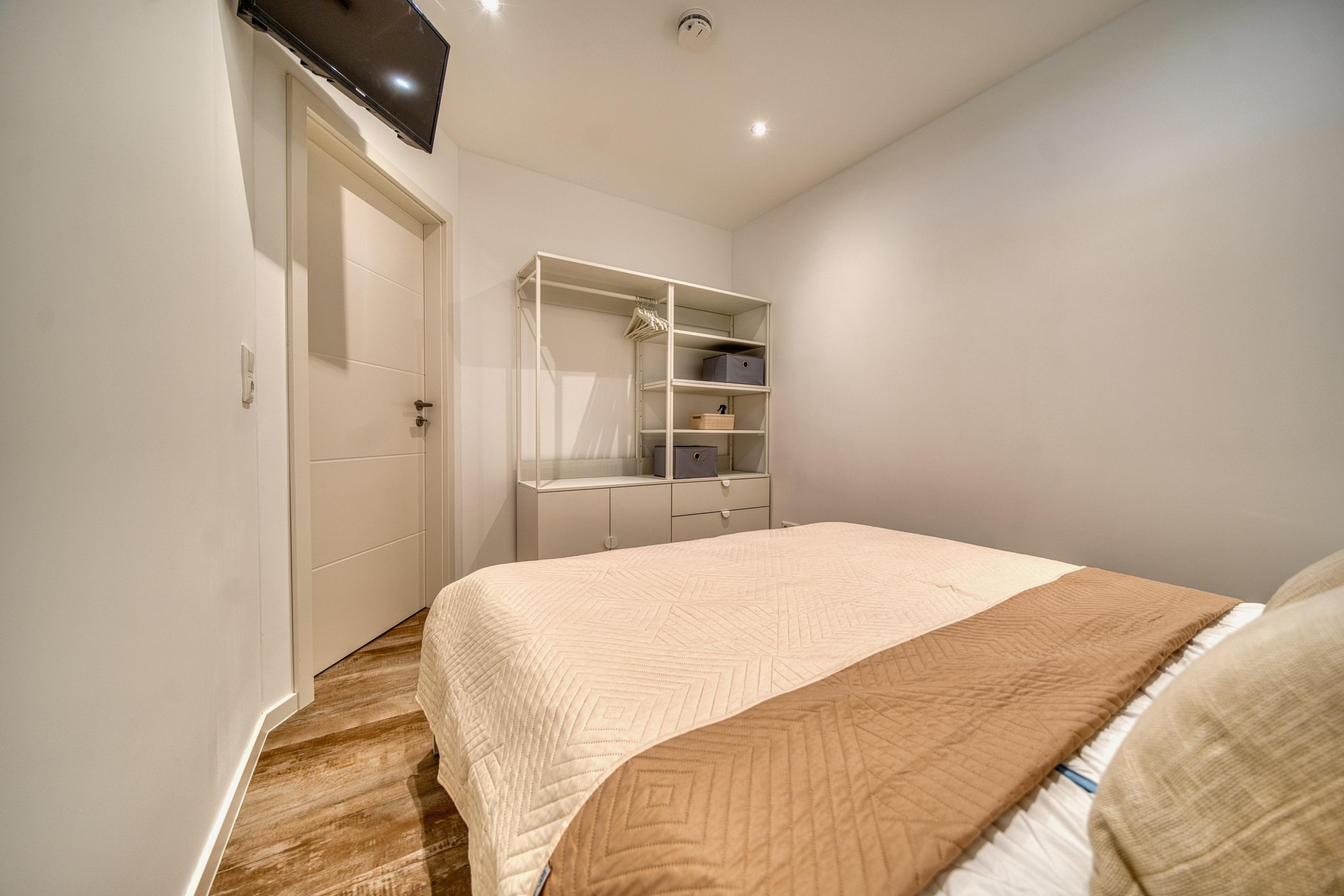 Schlafzimmer: Das separate Schlafzimmer garantiert mit seinem gemütlichen Doppelbett (160x200cm) sowie eigenem TV erholsame Nächte und ist zudem mit praktischen Staumöglichkeiten ausgestattet.