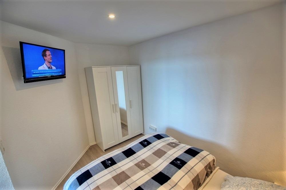 Schlafbereich mit Doppelbett und TVWohnbereich mit Smart TV, Ecksofa und Esstisch