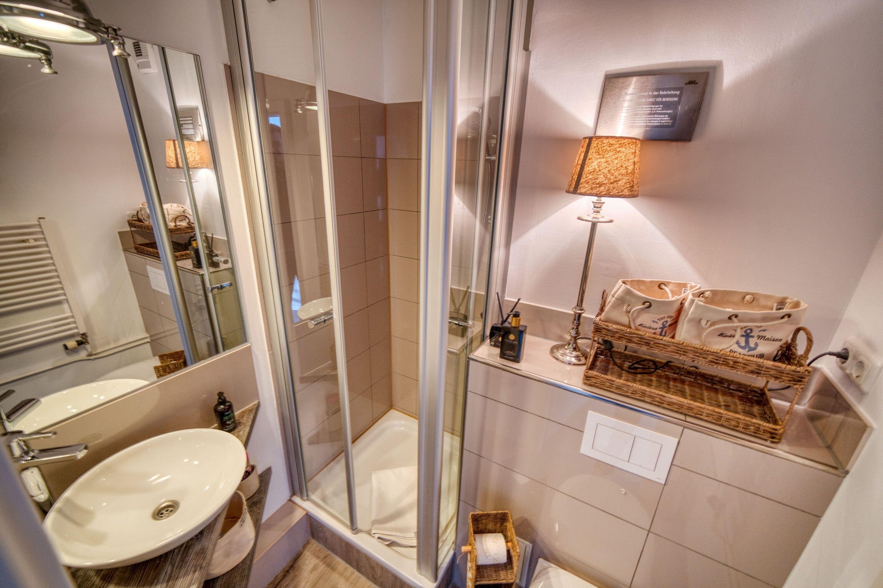Das moderne Badezimmer ist perfekt ausgestattet, um Ihnen eine entspannte Auszeit zu ermöglichen. Der elegante Vinylfußboden in der gesamten Unterkunft sorgt für ein warmes, einladendes Ambiente und ist gleichzeitig pflegeleicht – ideal für einen erholsamen Urlaub.