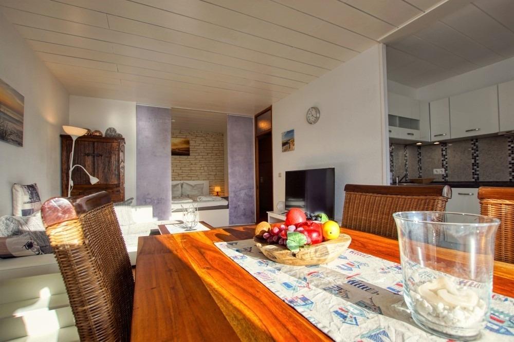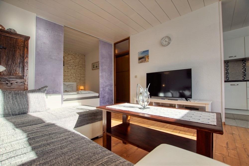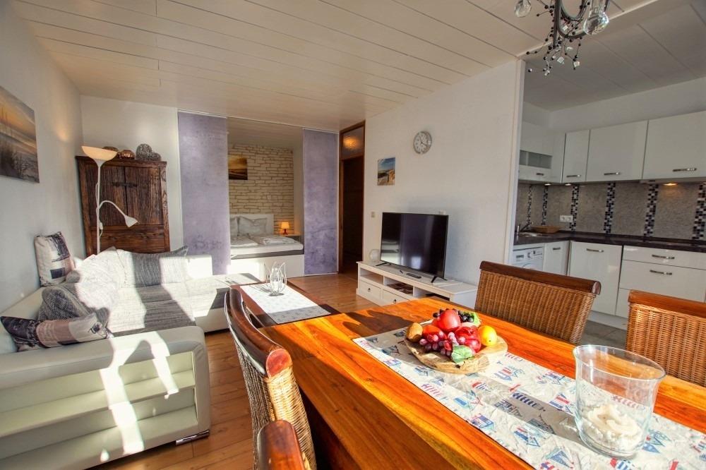 Wohn-Esszimmer mit Flachbild-TV und Radio