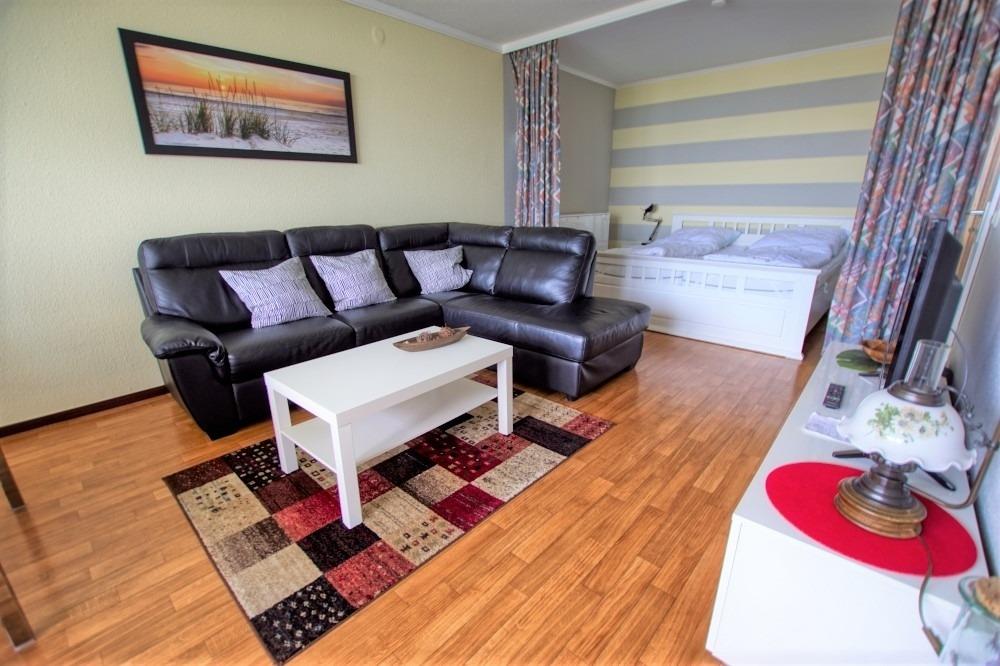 Kombinierter Wohn-/Schlafraum mit Doppelbett, Couchecke mit Ledersofa und Essplatz am Fenster