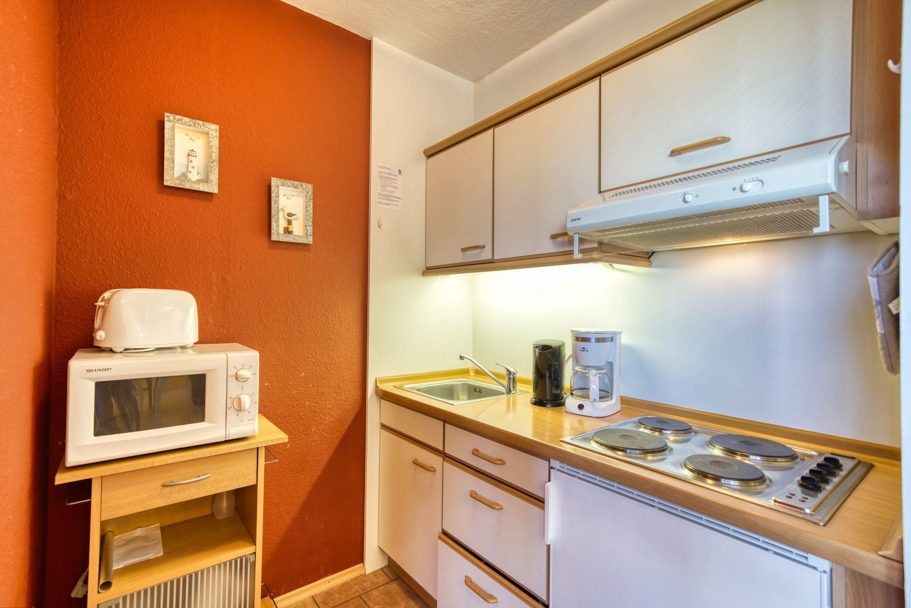 Komplett ausgestattete Küche mit Mikrowelle, Kühlschrank mit Gefrierfach und 4-Plattenherd