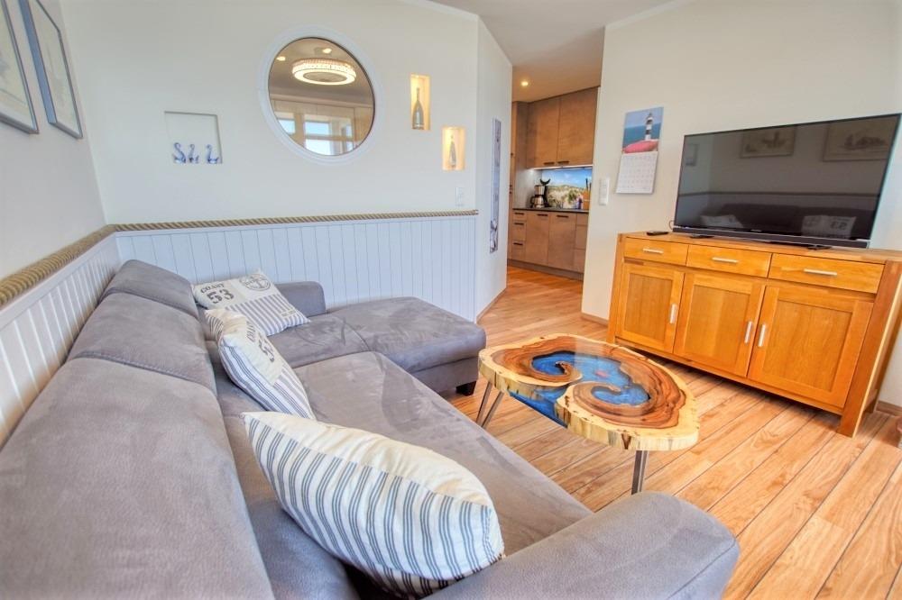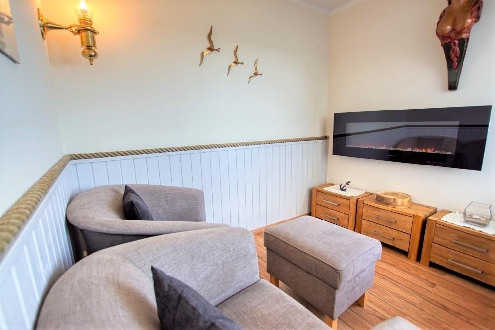 Offener Wohnbereich mit Flachbildfernseher, gemütlicher Sitzecke mit Elektrokamin und zwei Relax-Sesseln