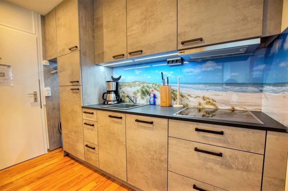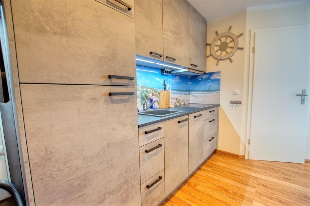 Küche im Eingangsbereich, hochwertig ausgestattet mit Spülmaschine, Ceranfeld, Kühlschrank mit Gefrierfach, Mikrowelle mit Backofenfunktion und Kaffeemaschine