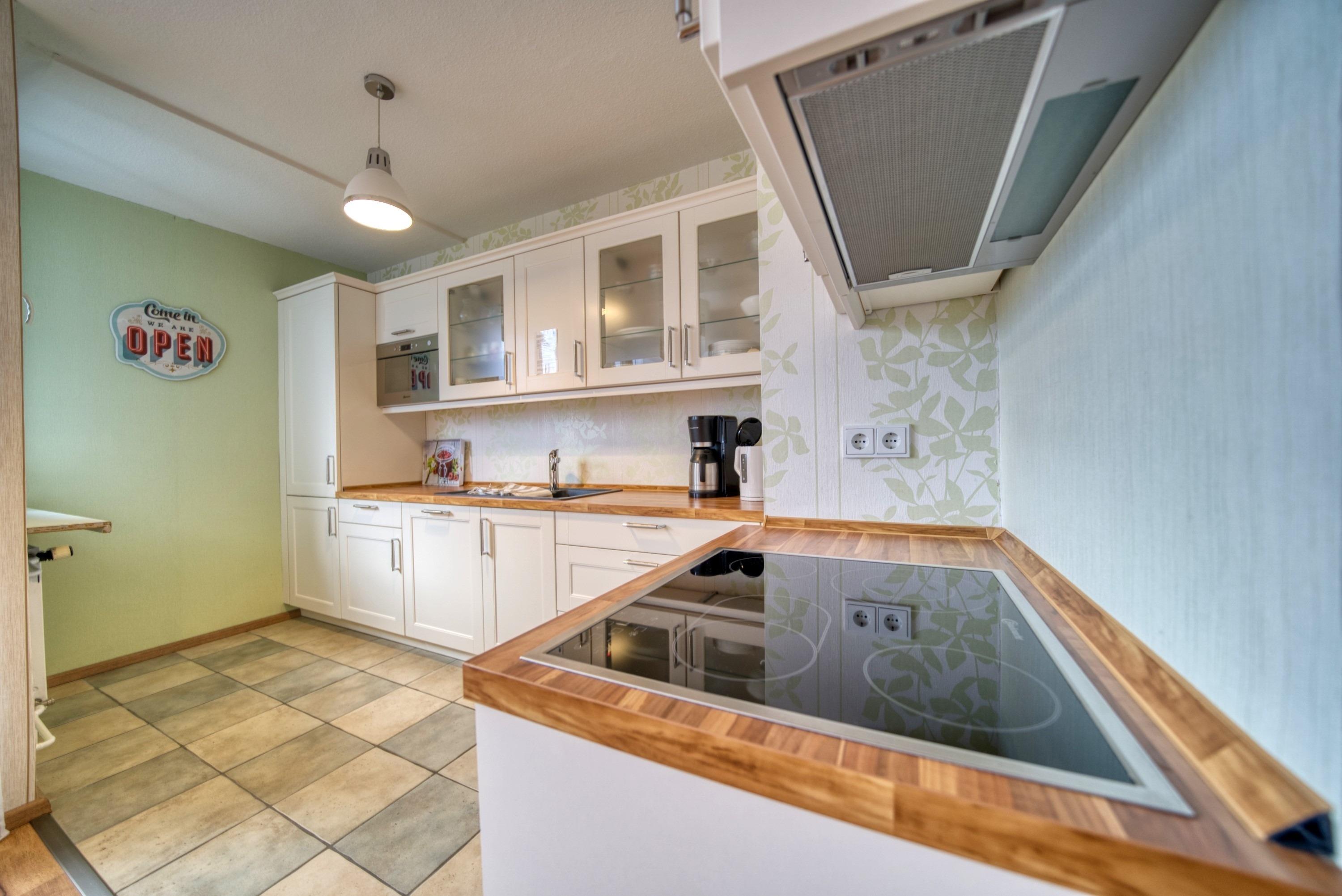 Komplett modernisierte Küche mit Kaffeemaschine, Wasserkocher, Toaster, Kühlschrank mit Gefrierfach, 4-Platten-Herd und Backofen