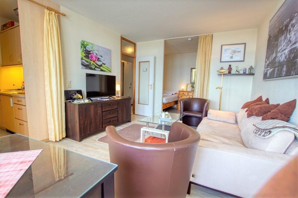 Wohn-Esszimmer mit Sofa, Flachbild-TV, Radio und Einzelbetten