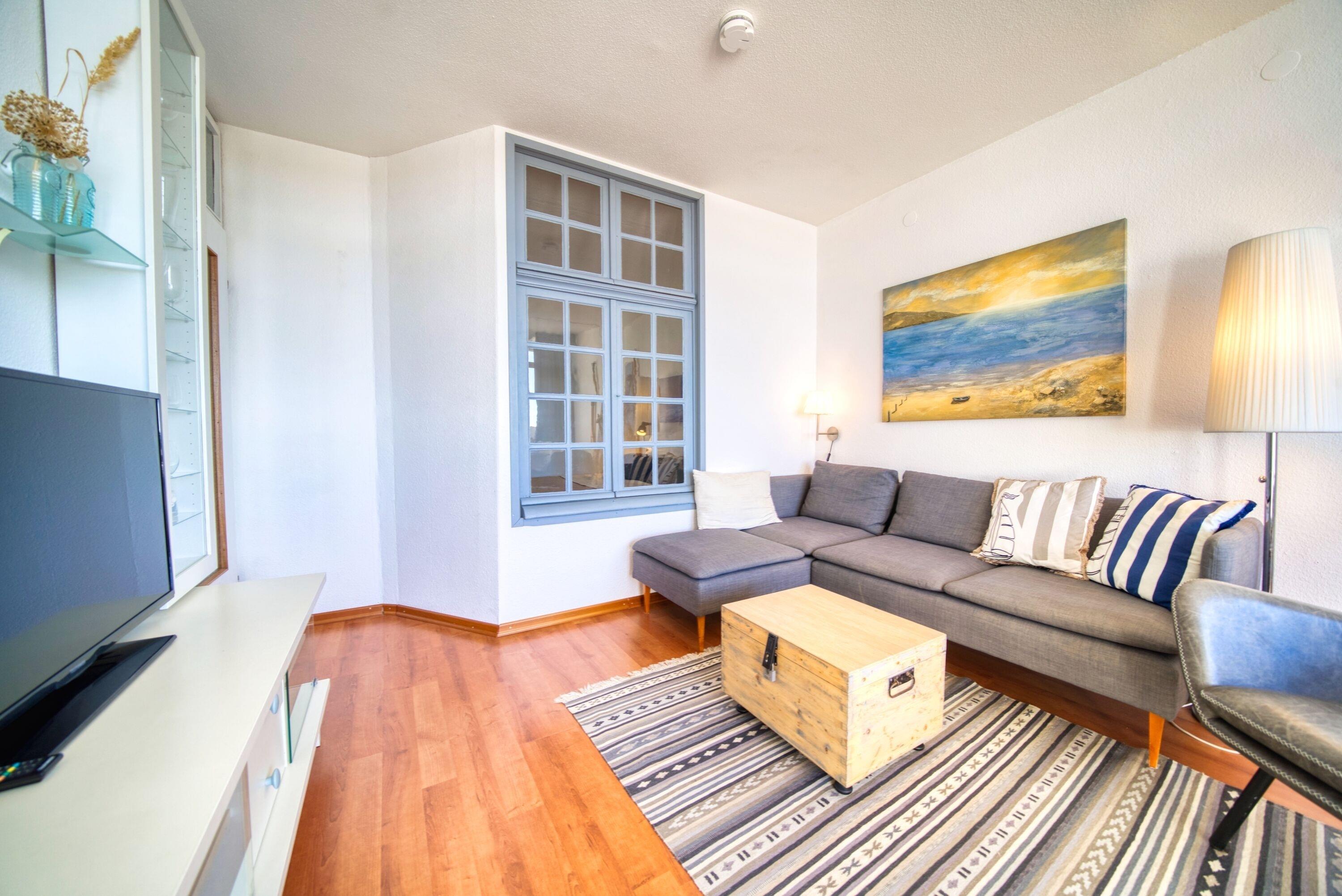 Heller Wohnbereich mit großem Sofa, großzügigem Flachbild-TV und gemütlicher Atmosphäre