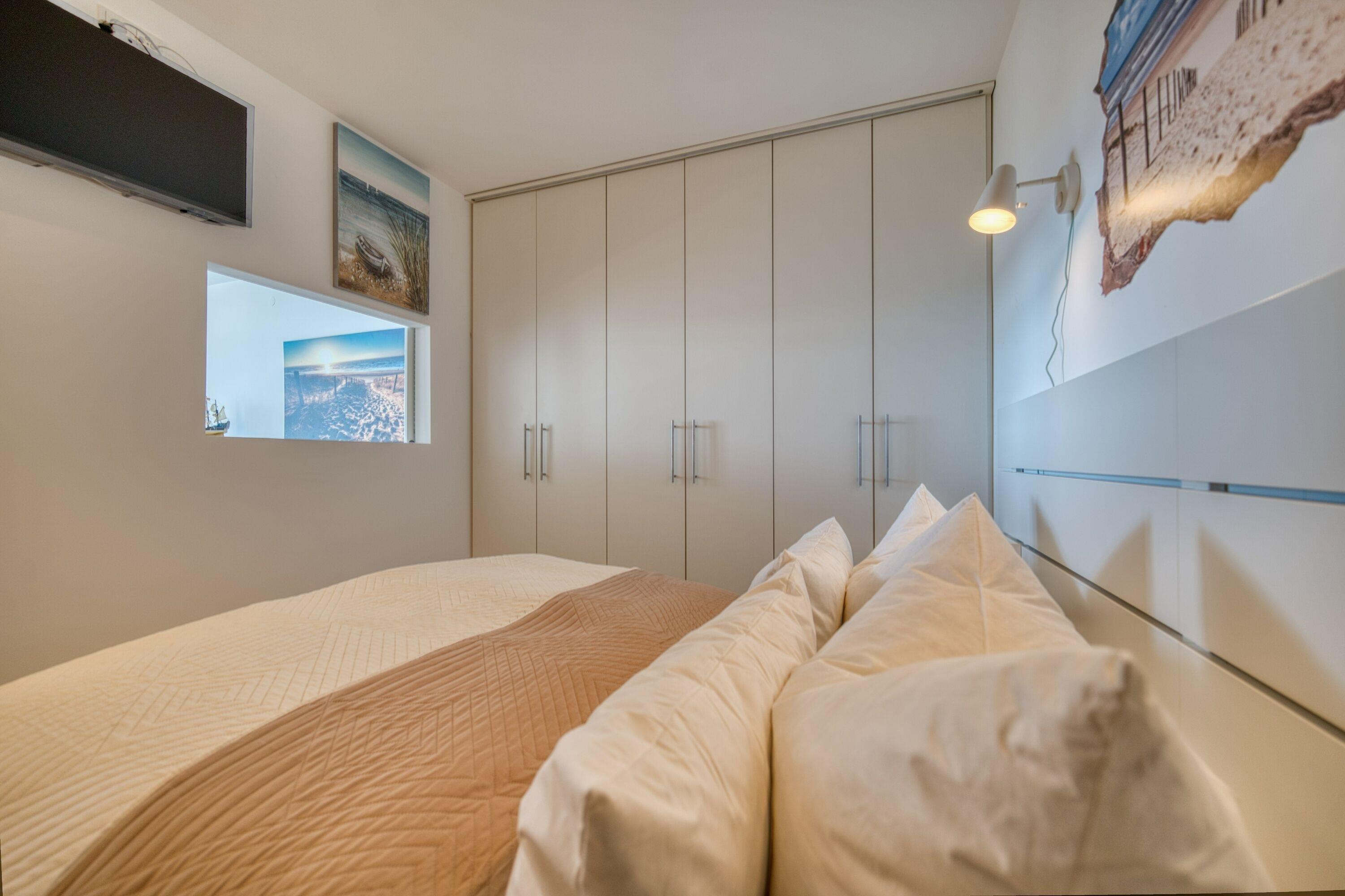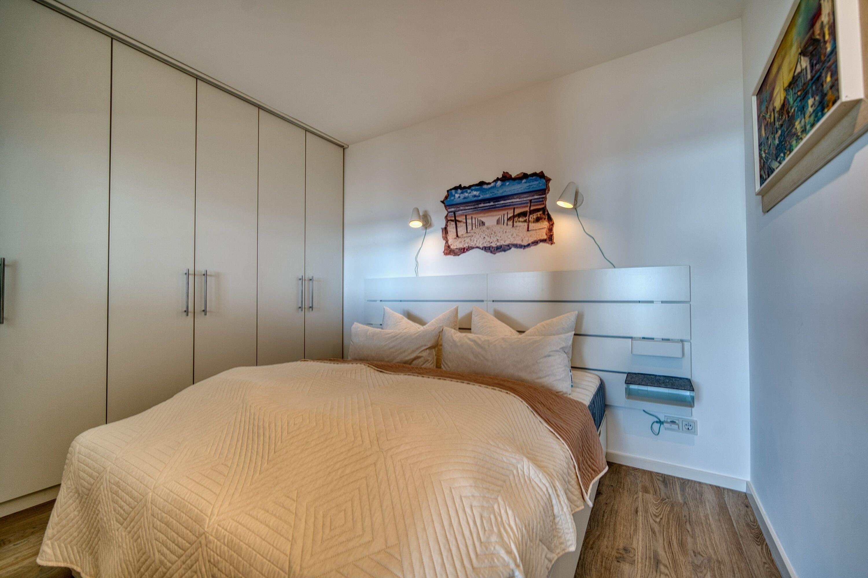 Elternschlafzimmer: Doppelbett (160x200 cm), Smart-TV, großer Einbauschrank, Bettkasten mit 6 Schubladen