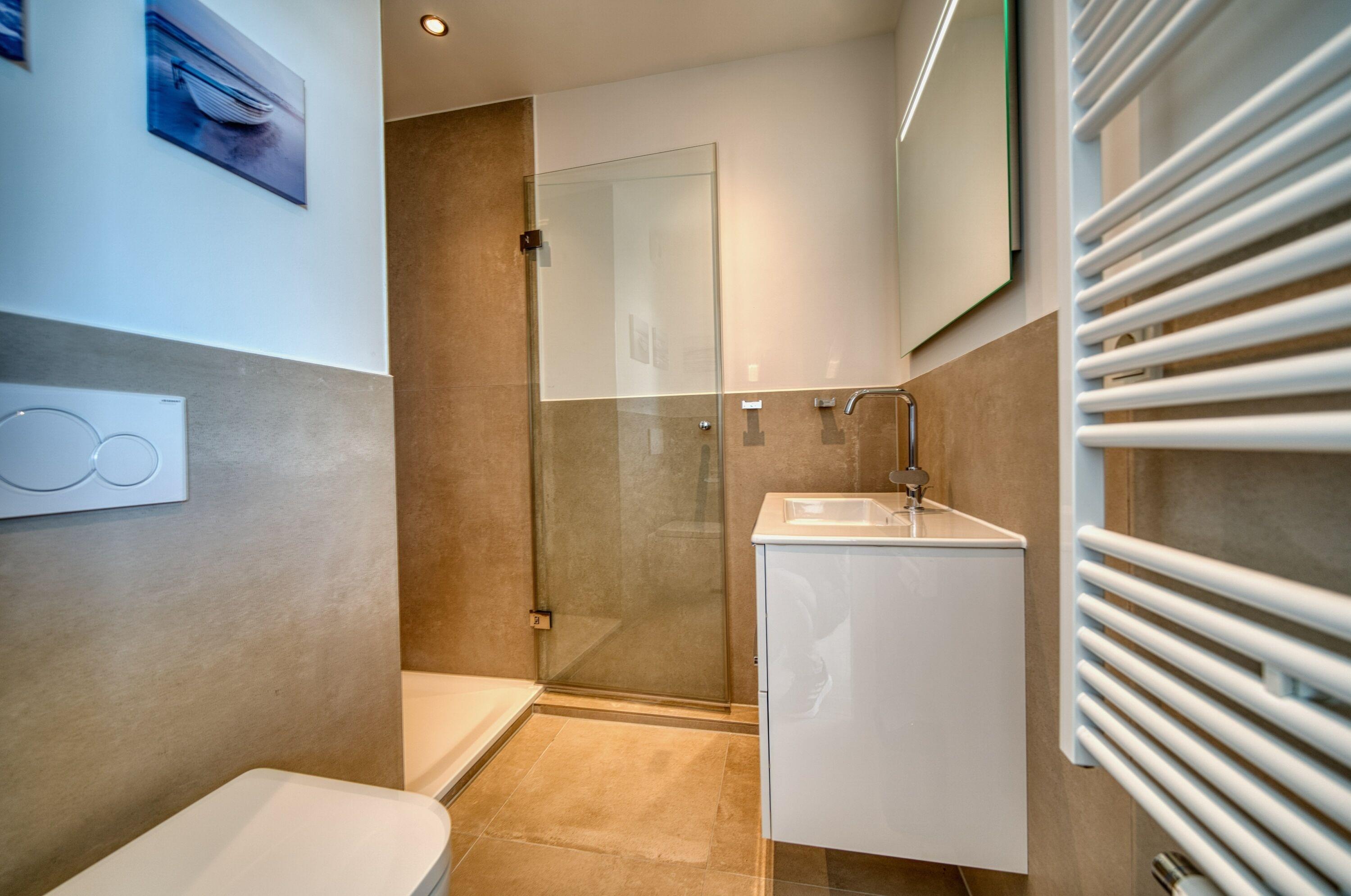 Das Badezimmer begeistert durch eine neue, großzügige Duschkabine und moderne Ausstattung.