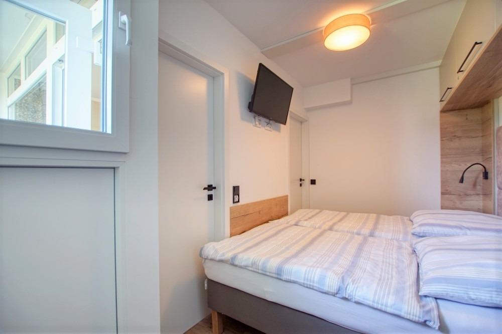 Separates Schlafzimmer mit Doppelbett, TV [&] Außenfenster