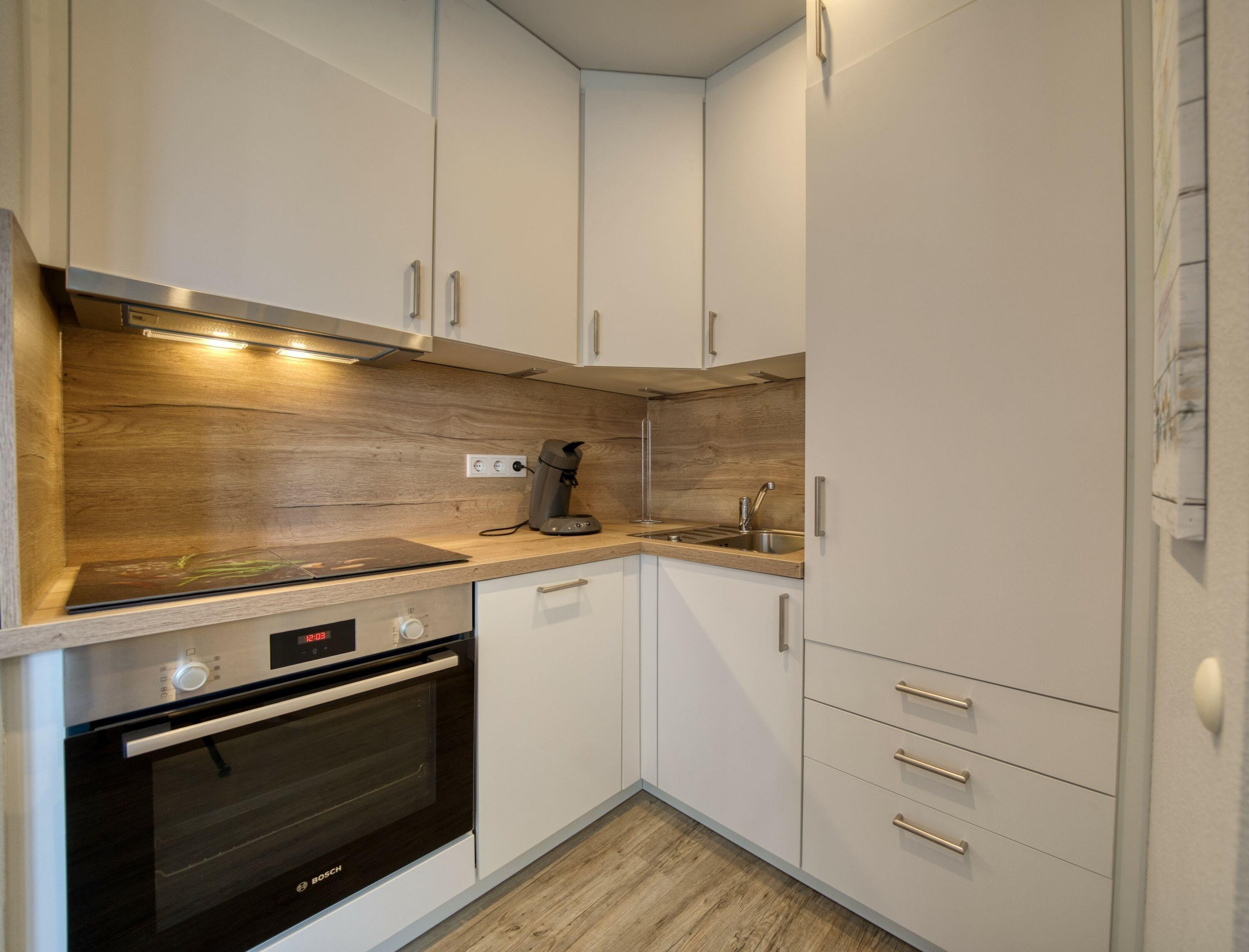Seit 2025 befindet sich eine neue, vollständig eingerichtete Küche mit Geschirrspüler, Backofen, Kühlschrank, Kaffeemaschine und Ceranherd in der Wohnung.