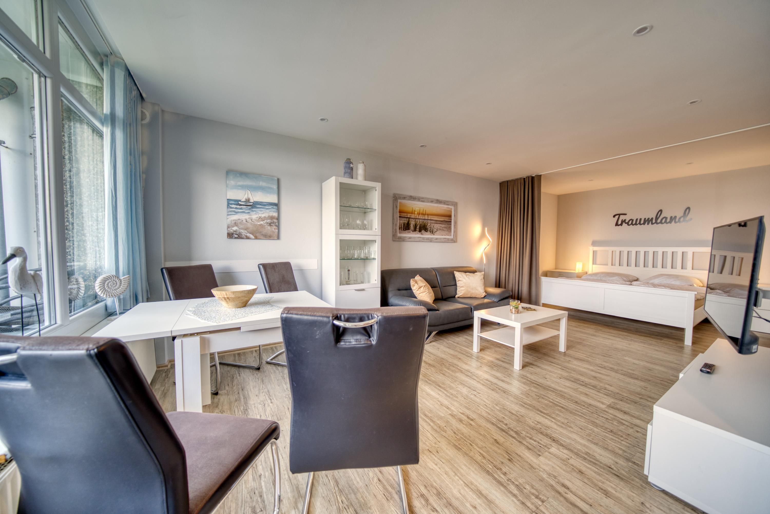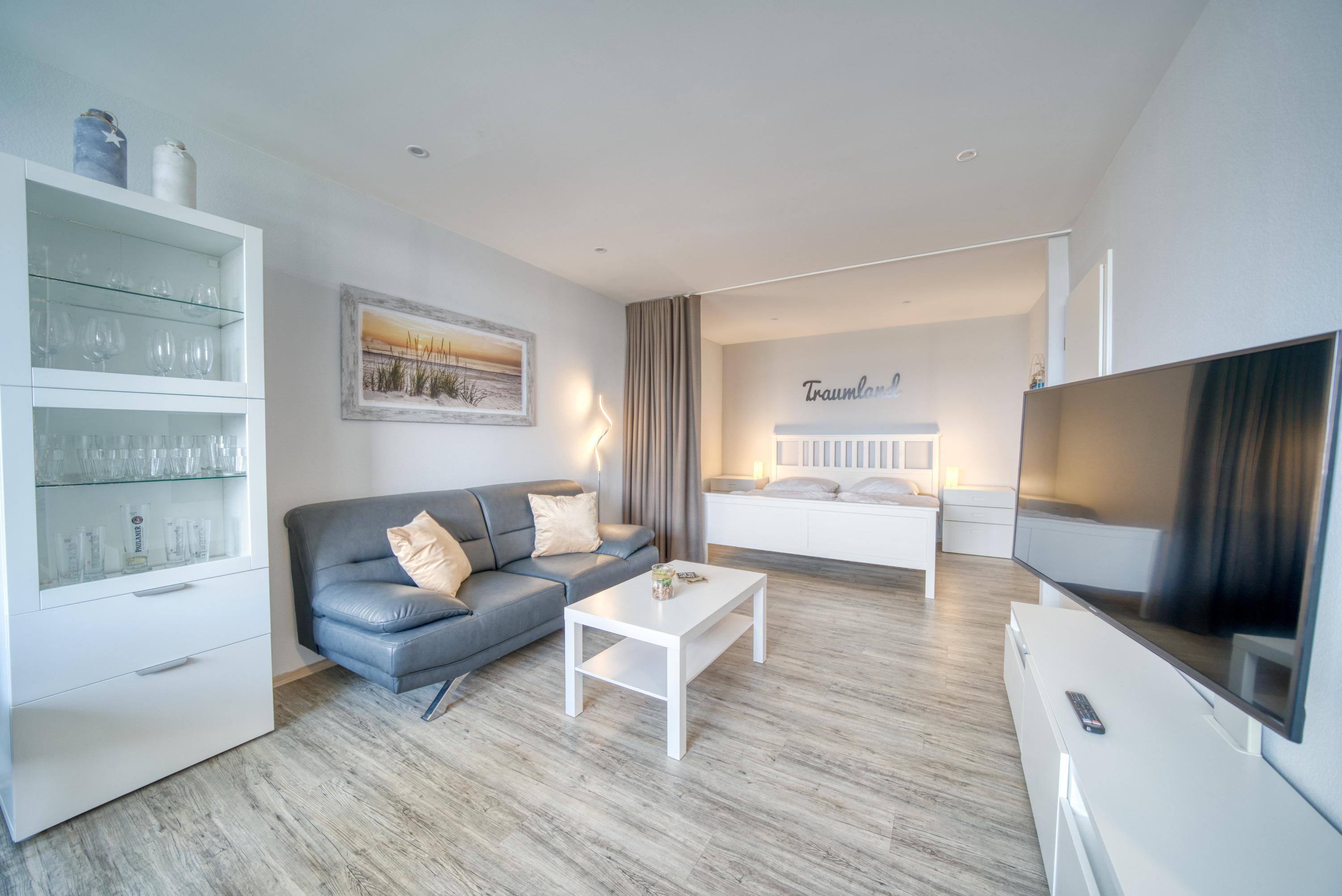 Die Wohnung verfügt über eine Wohnfläche von 45 qm mit folgender Aufteilung: Wohn-/Esszimmer mit großem 50 Zoll Smart-TV.