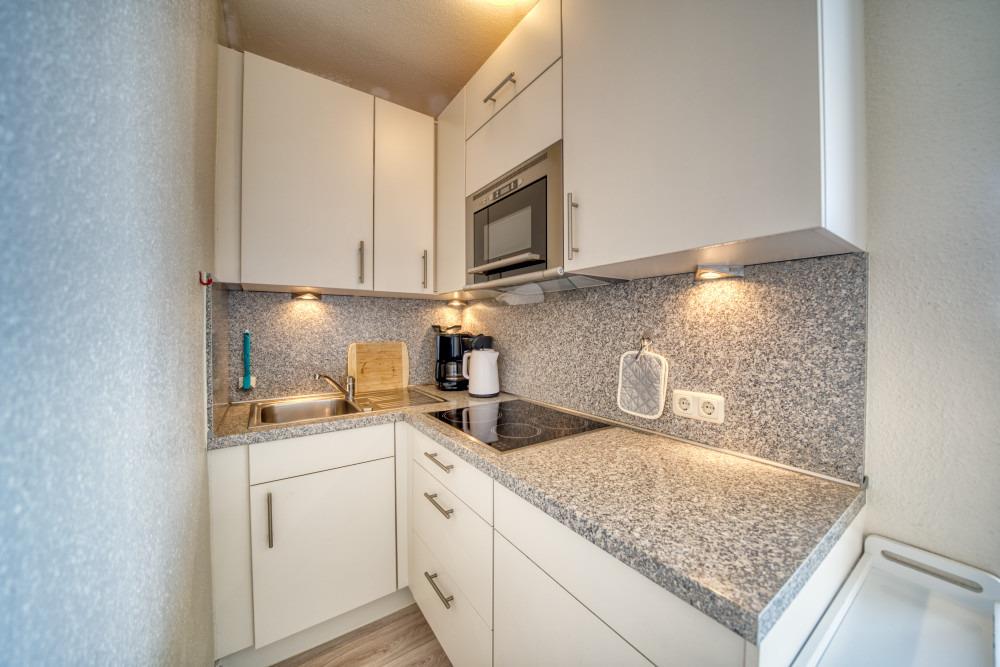 Küche mit Ceranherd, Kühlschrank mit Gefrierfach, Mikrowelle, Toaster, Wasserkocher und Filterkaffeemaschine