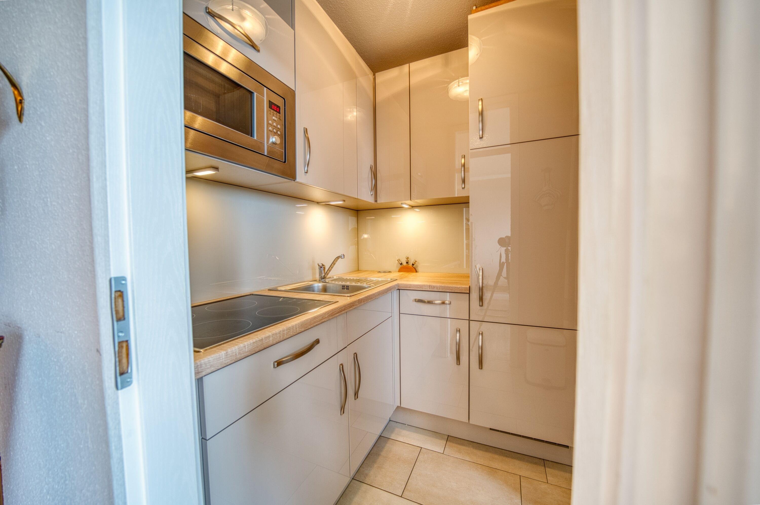 Das moderne Badezimmer ist mit einer Duschkabine, WC und Waschbecken ausgestattet – hell, gepflegt und funktional.In der voll ausgestatteten Küche finden Sie alles, was Sie für Ihren Aufenthalt benötigen: Ceranfeld, Kühlschrank, Filterkaffeemaschine und eine Mikrowelle stehen bereit.