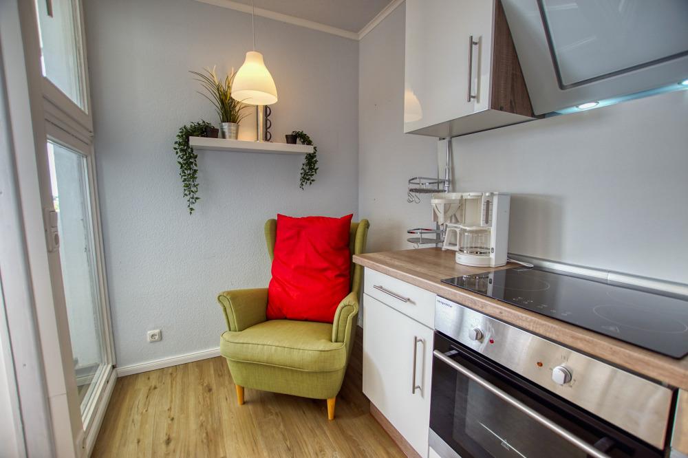 Komplett ausgestattete Küche mit Mikrowelle, Kühlschrank mit Gefrierfach, 4-Plattenherd, Geschirrspüler und Backofen