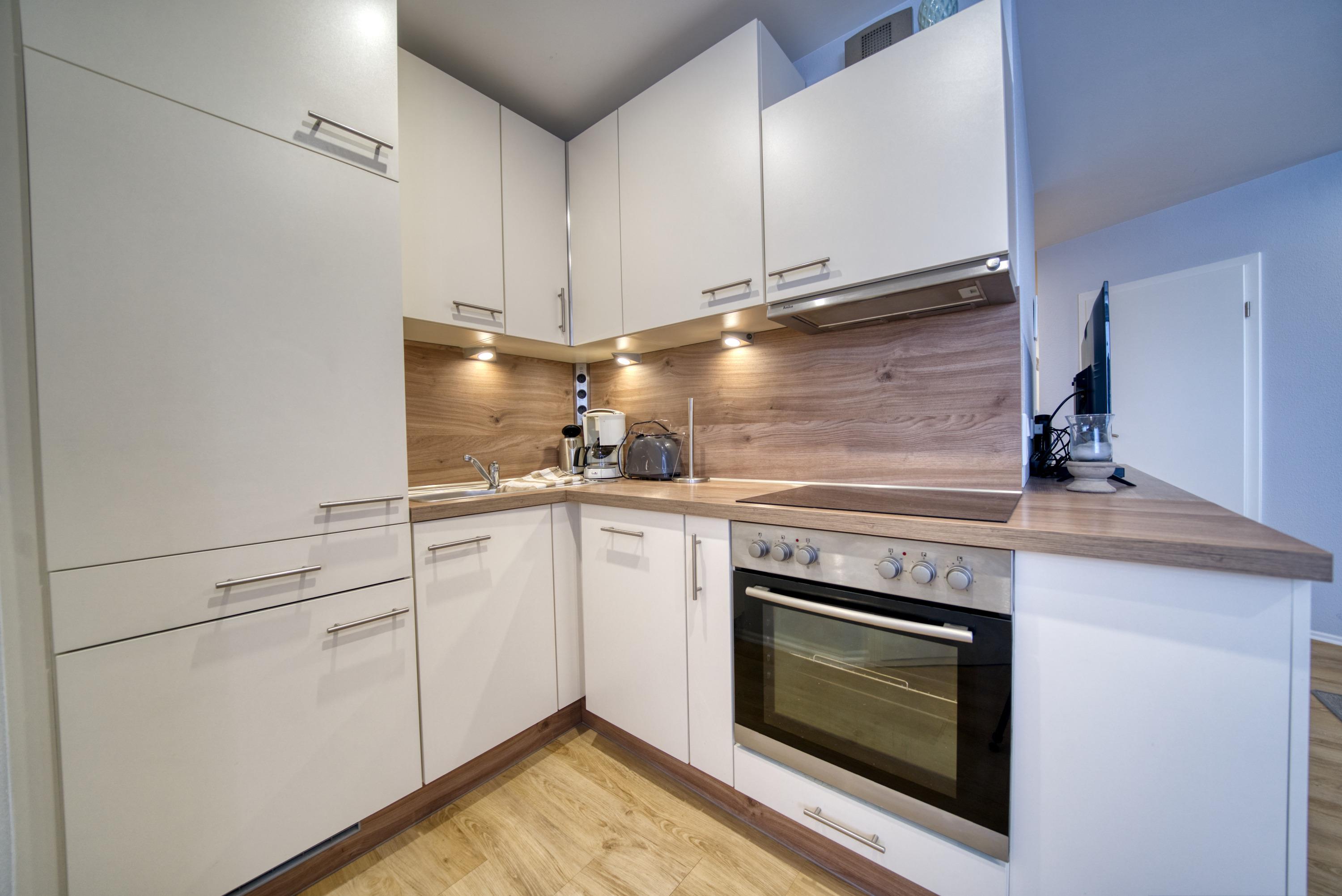 Küche: Neu und komplett ausgestattet mit Geschirrspüler, Backofen, 4-Platten-Cerankochfeld, Mikrowelle, Kühlschrank mit Eisfach, Kaffeemaschine, Wasserkocher und umfangreicher Küchenausstattung