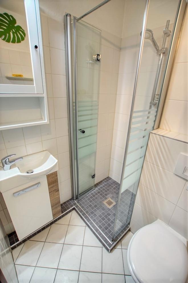 Badezimmer mit WC und Duschkabine mit niedrigem Einstieg