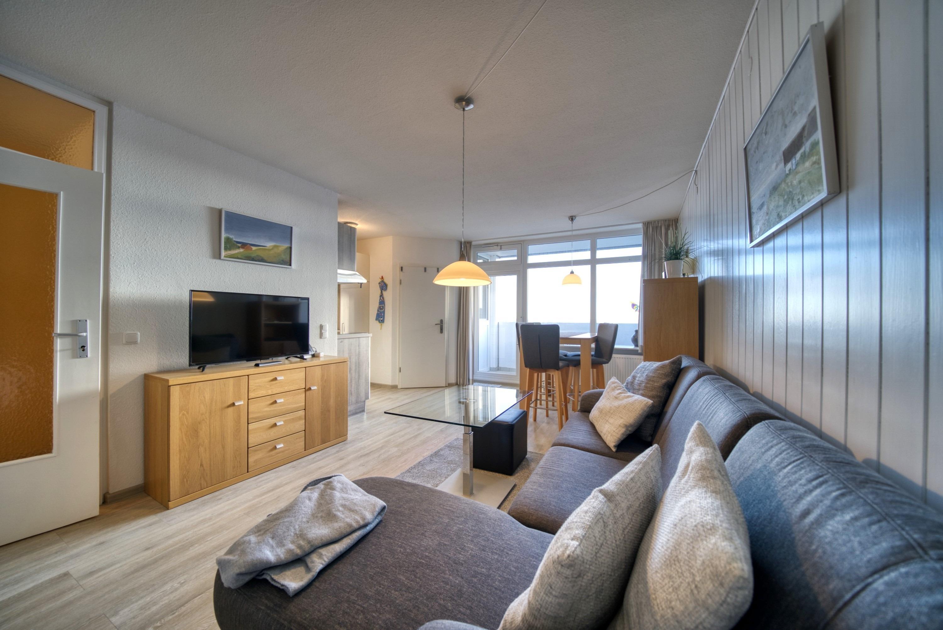 Wohn- und Esszimmer mit Flachbild-TV und Radio
