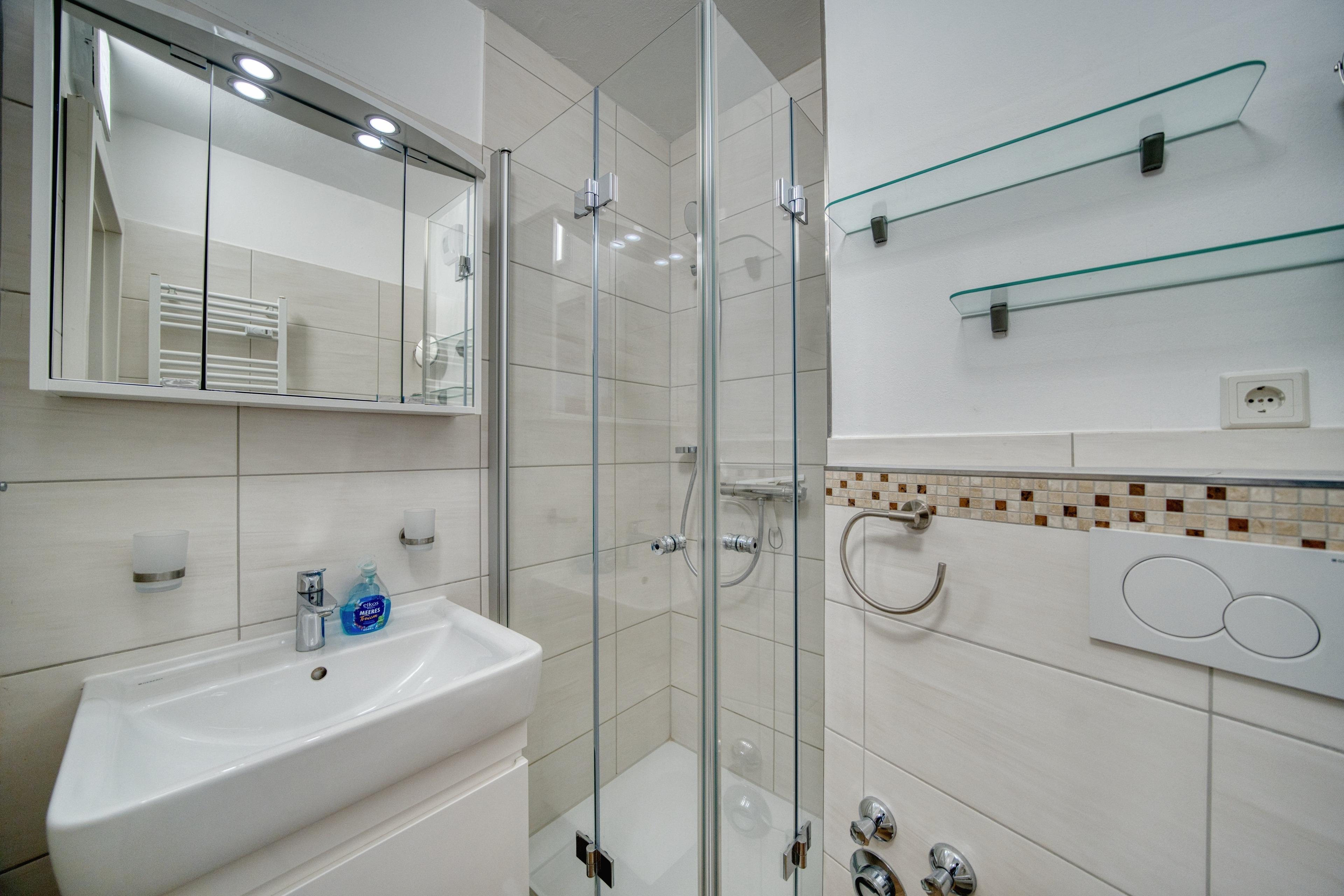 Bad mit moderner Dusche (niedriger Einstieg, Glastrennwand, Thermostatarmatur), Waschtisch mit Unterschrank und Spiegelschrank