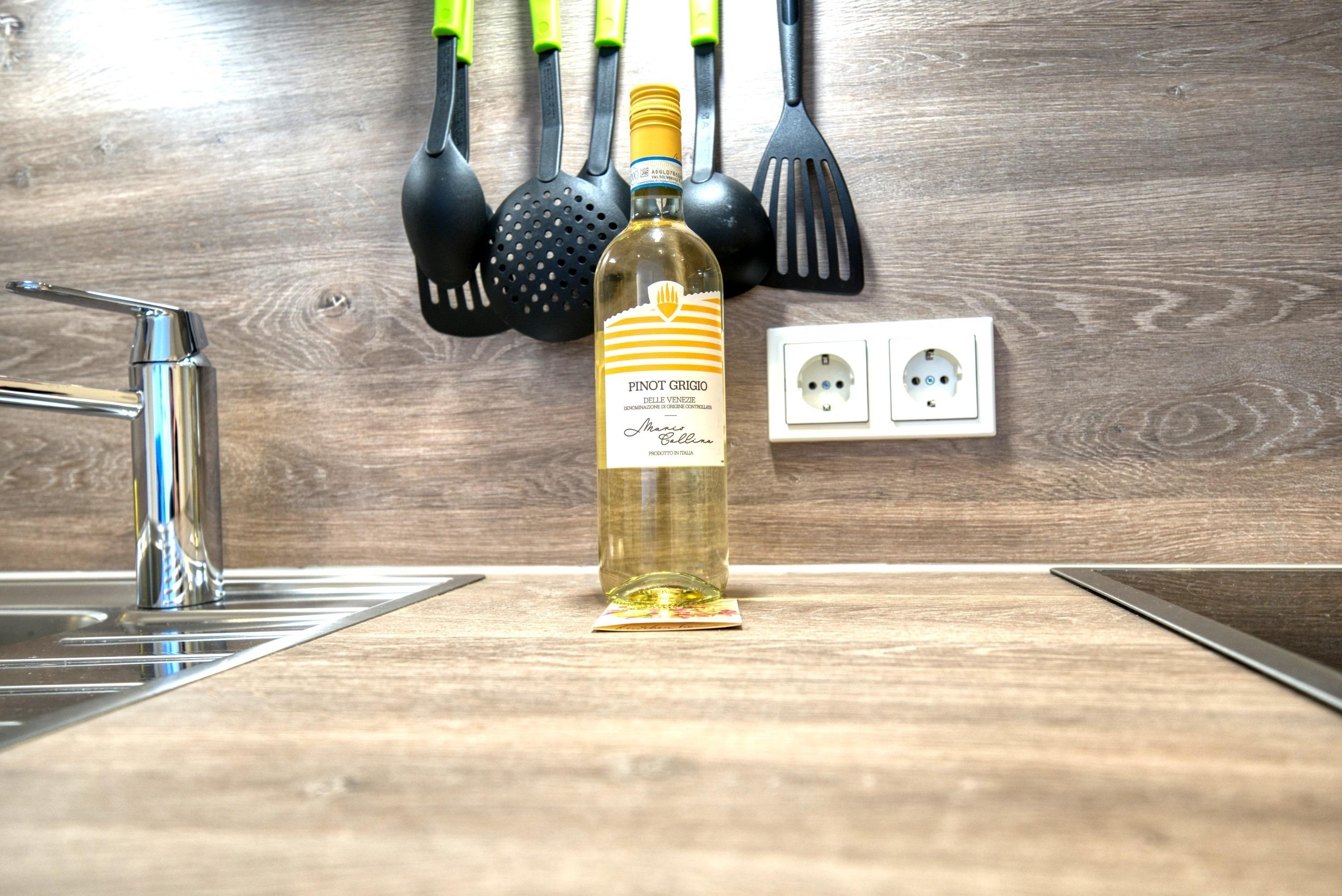 Küche: Spülmaschine, Backofen, Ceranfeld, Kühlschrank mit Gefrierfach, Kaffeemaschine