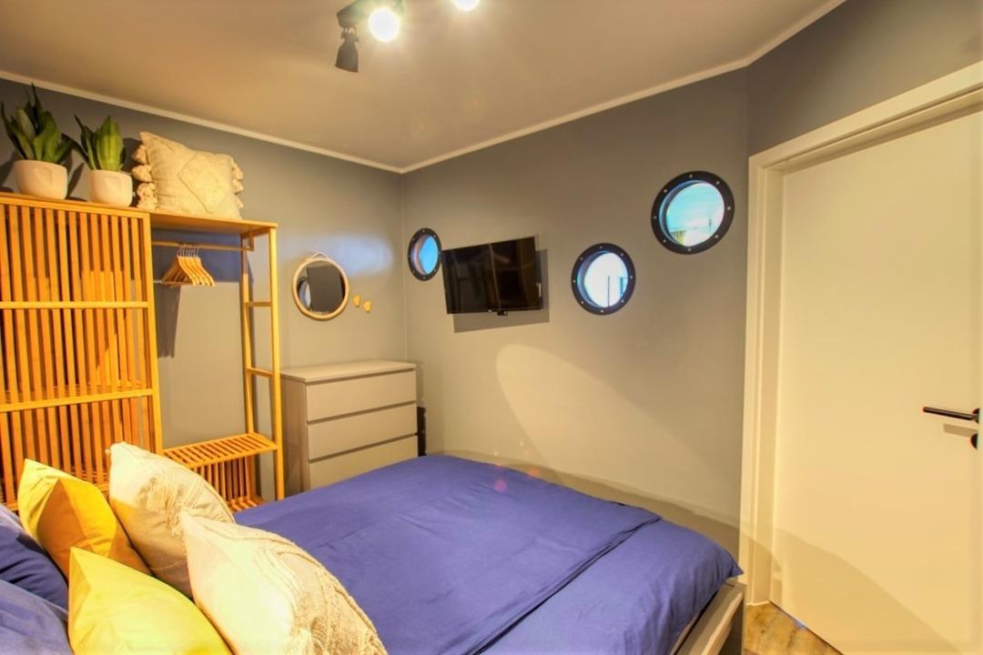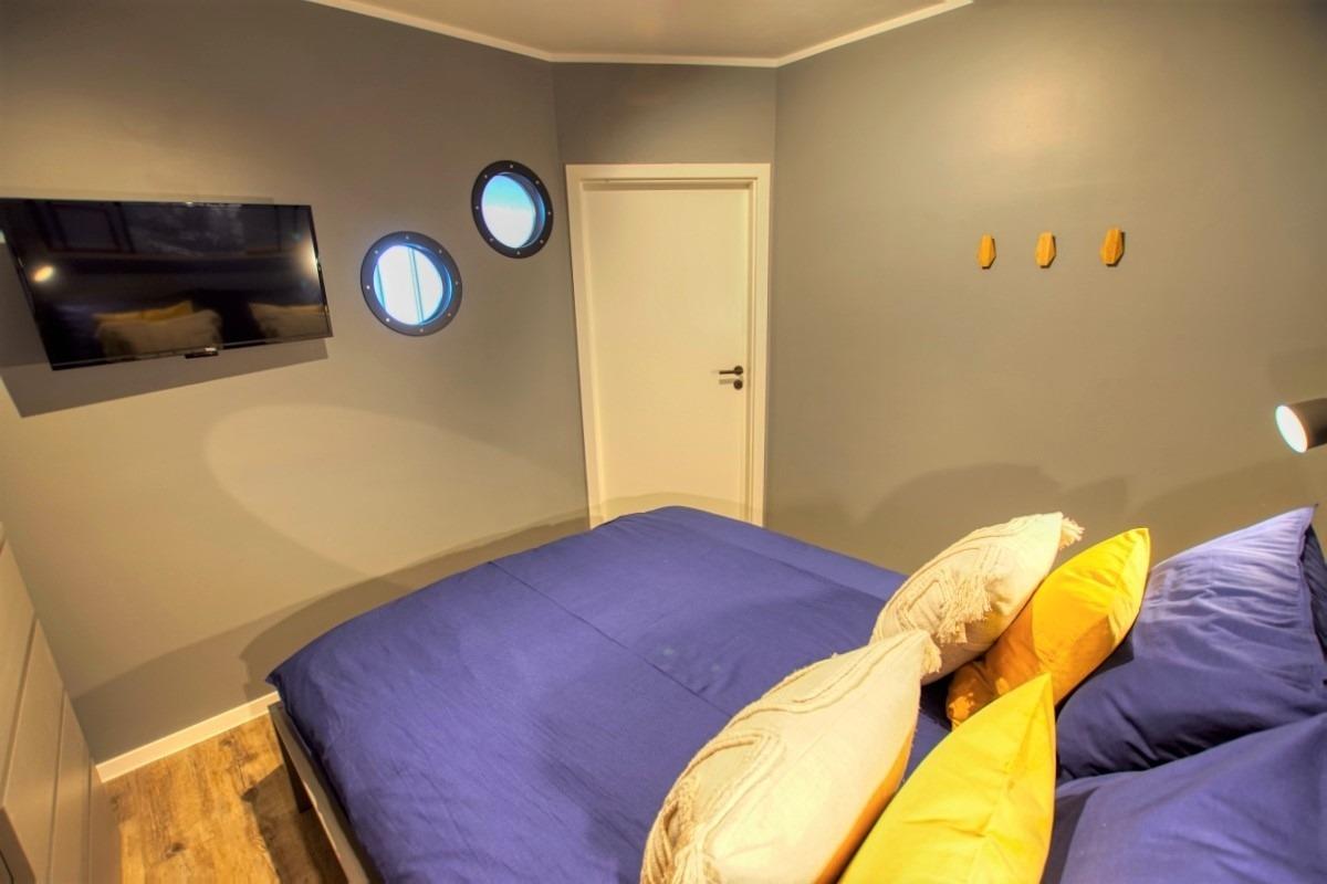 Schlafzimmer mit Doppelbett und eigenem TV