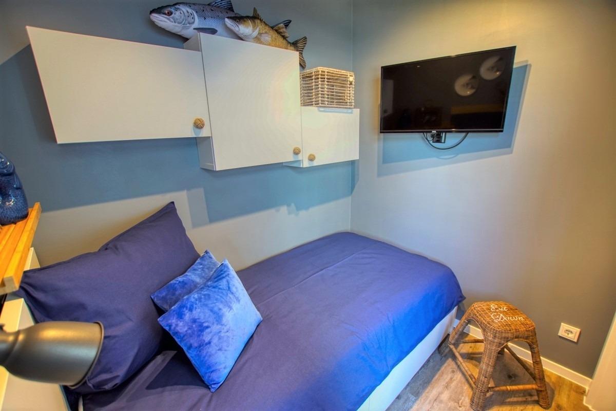 Kinderzimmer mit ausziehbarem Bett (ausgeklappt 160x200 cm) und zusätzlichem TV – perfekt für Familien
