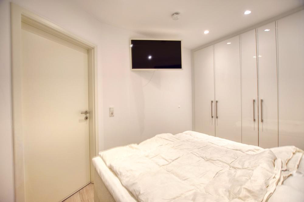 Elternschlafbereich mit Doppelbett, TV und hochwertigem Einbauschrank