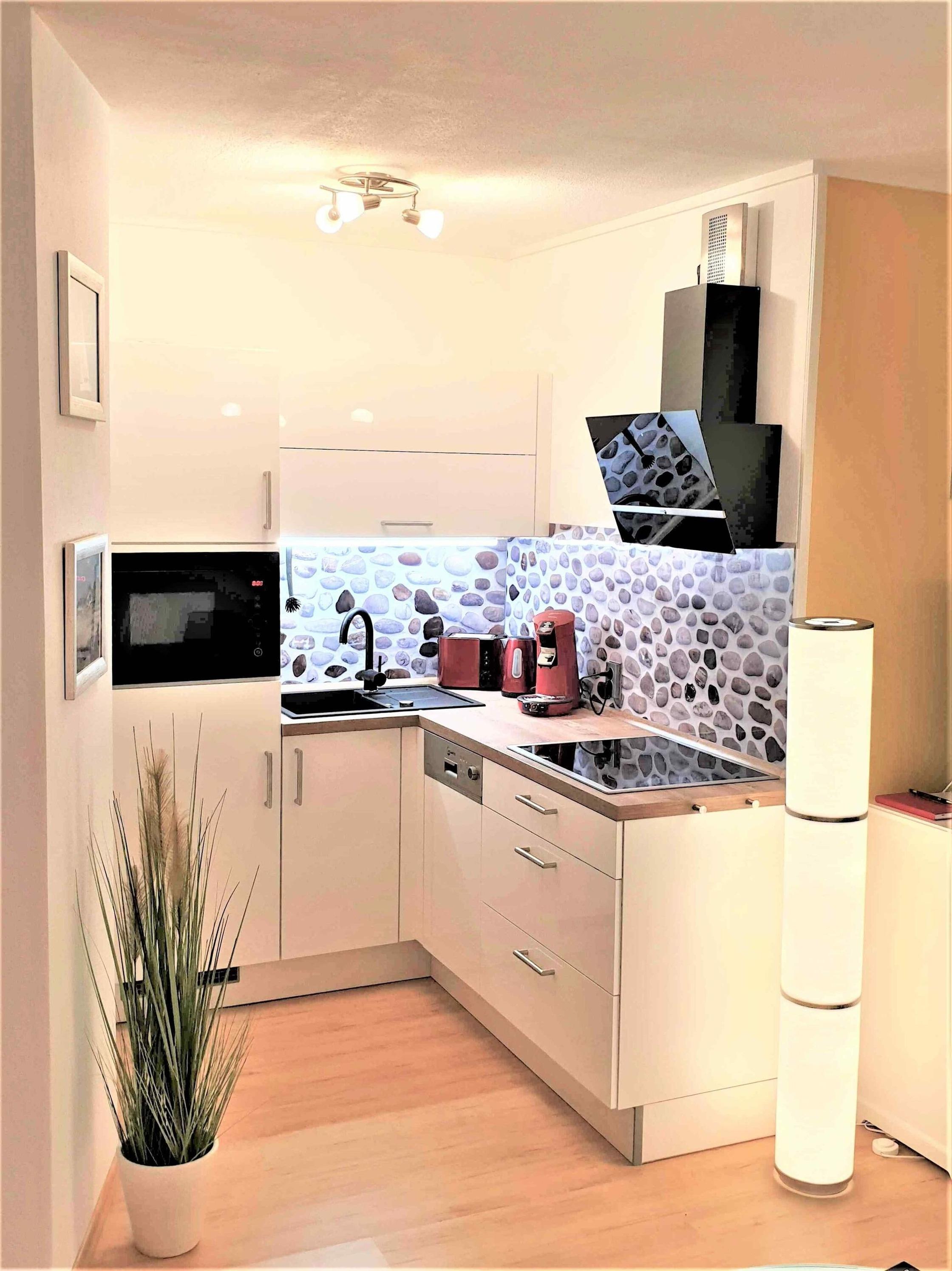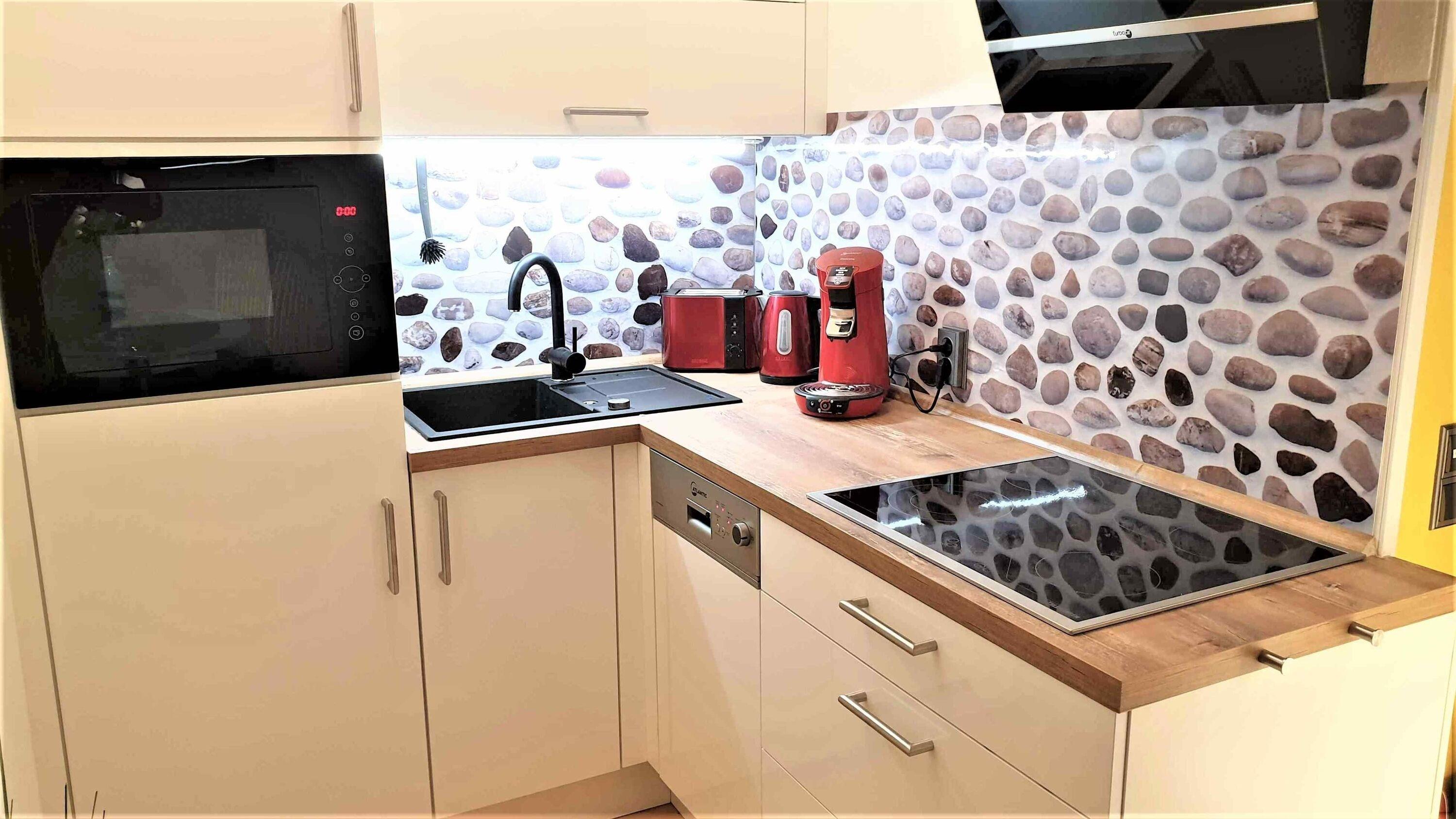 Voll ausgestattete Küche mit Spülmaschine, Backofen/Mikrowelle, Wasserkocher, Toaster, Pad- und Kaffeemaschine