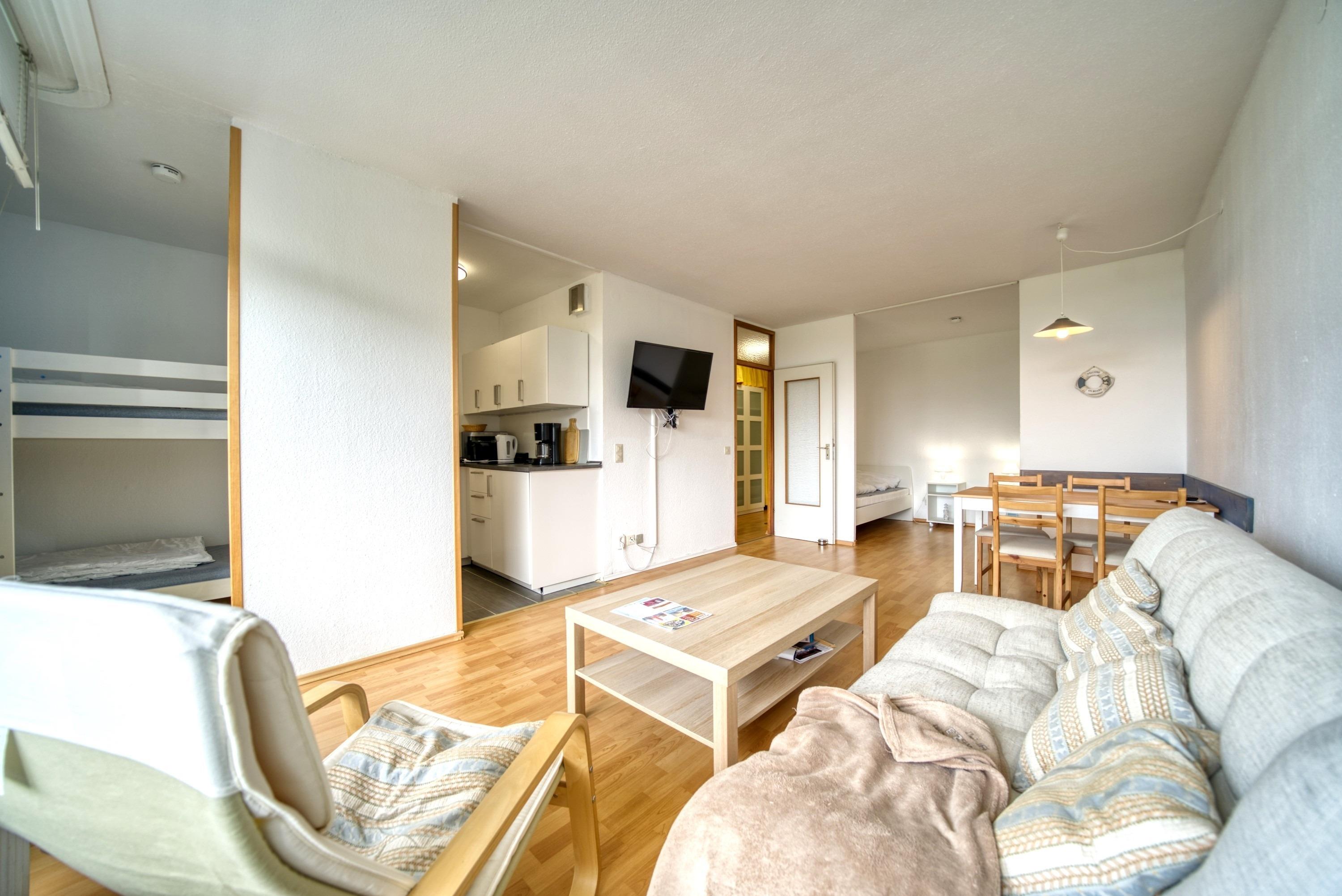 Helle und freundlich eingerichtete Ferienwohnung im Haus L Ferienpark, Erdgeschoss, mit Balkon zur Südseite. Genießen Sie viel Sonne und den Blick auf die Grünanlagen.