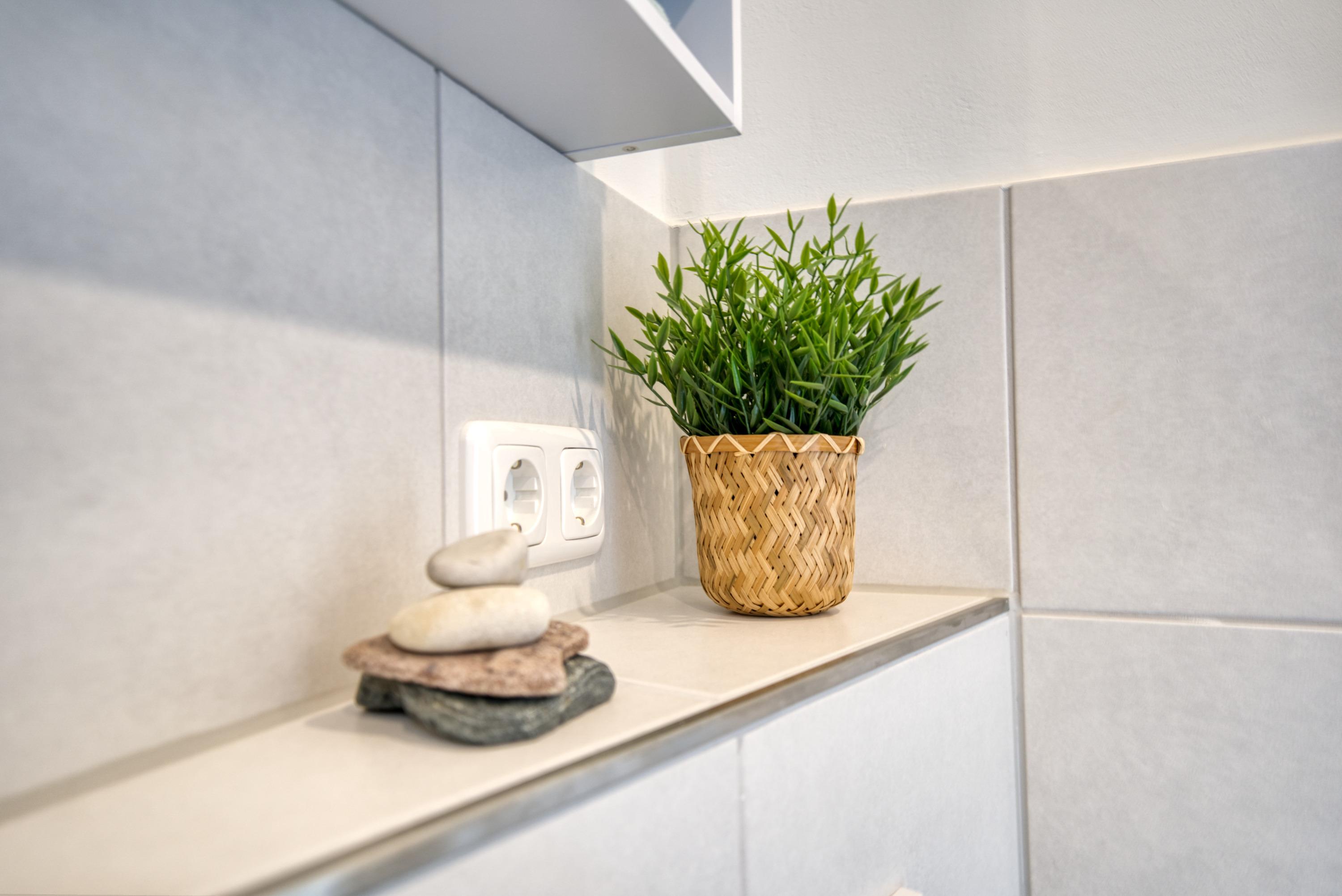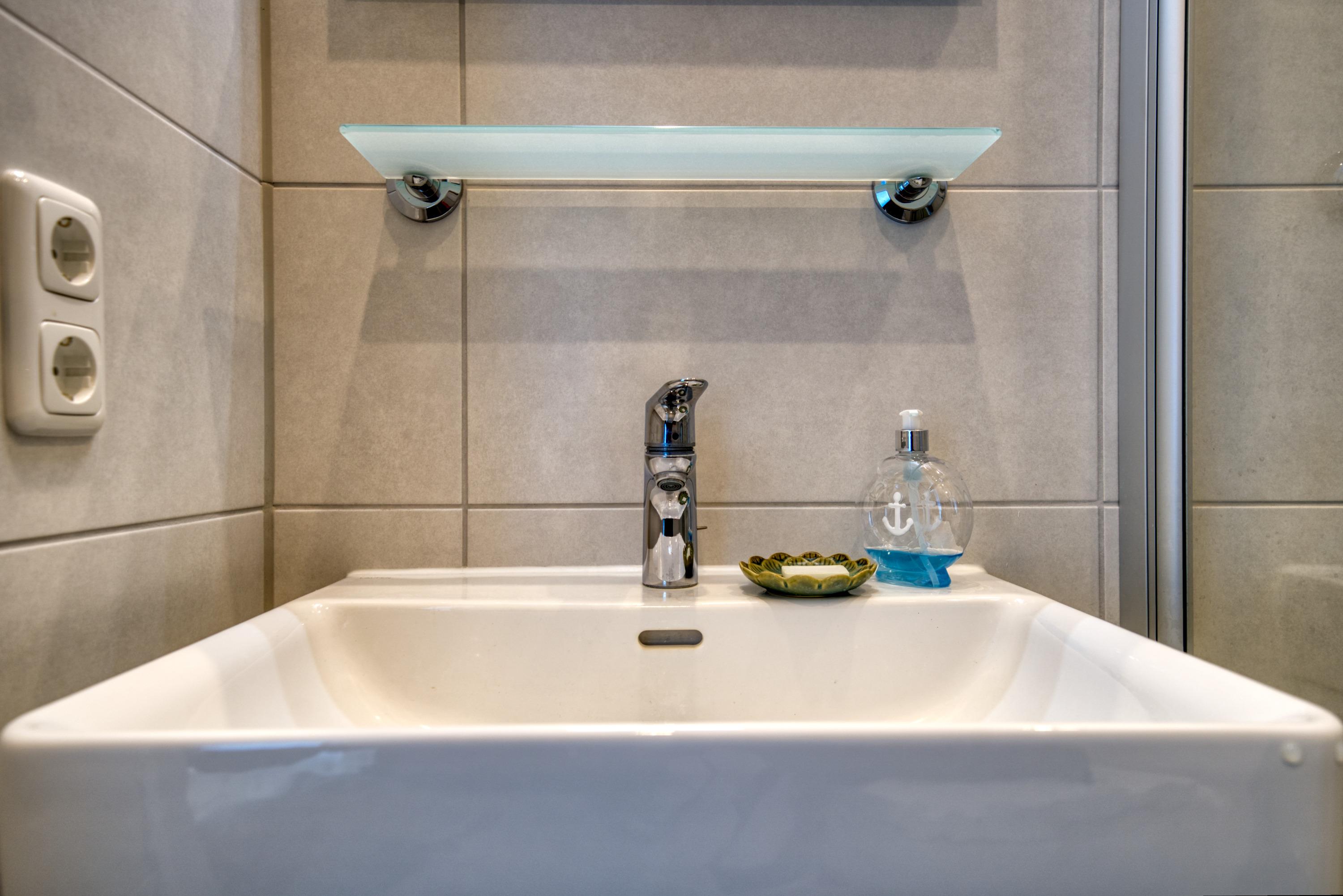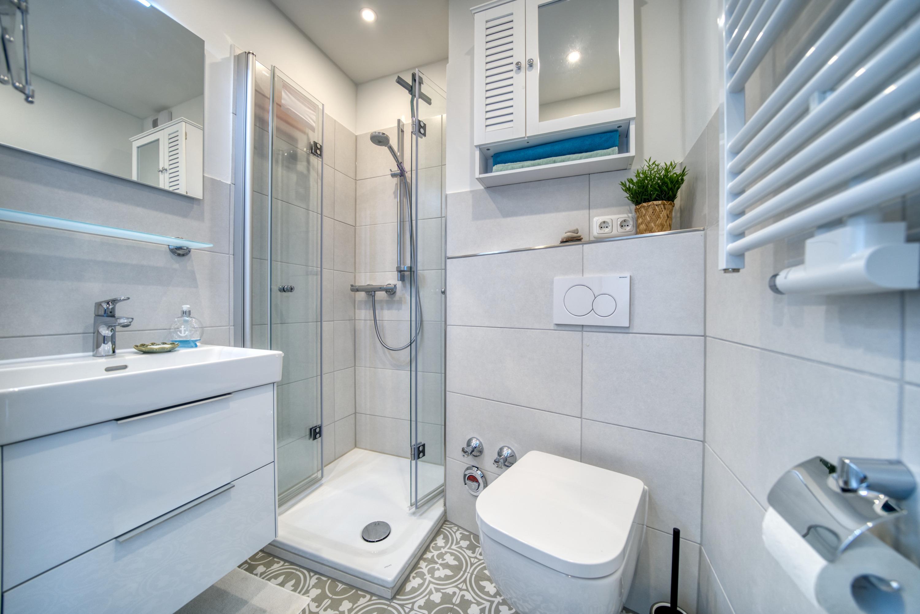 Badezimmer mit Duschkabine (niedriger Einstieg), Handtuchtrockner, viel Stauraum und Waschtisch