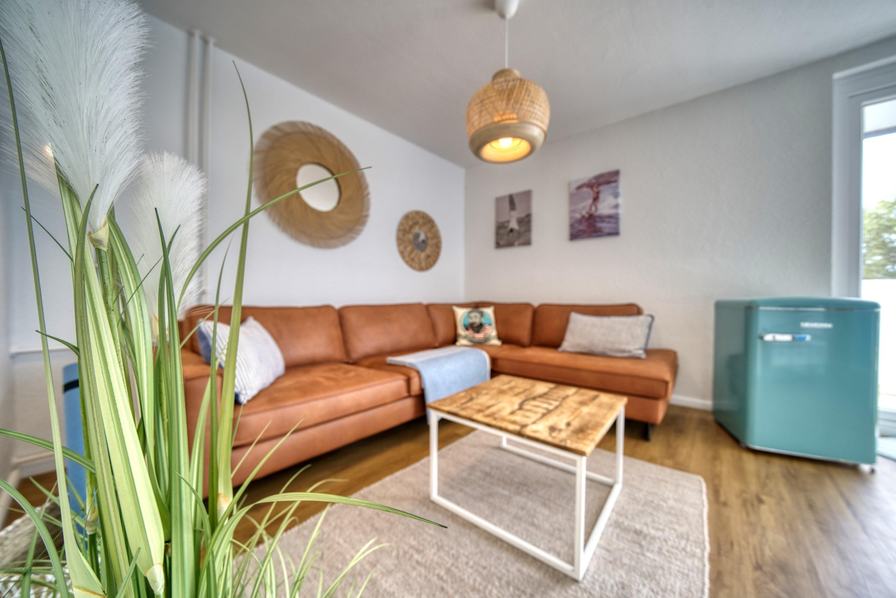 Offener Wohnbereich mit hochwertiger Couch, Flachbild-TV und pflegeleichtem Vinylboden