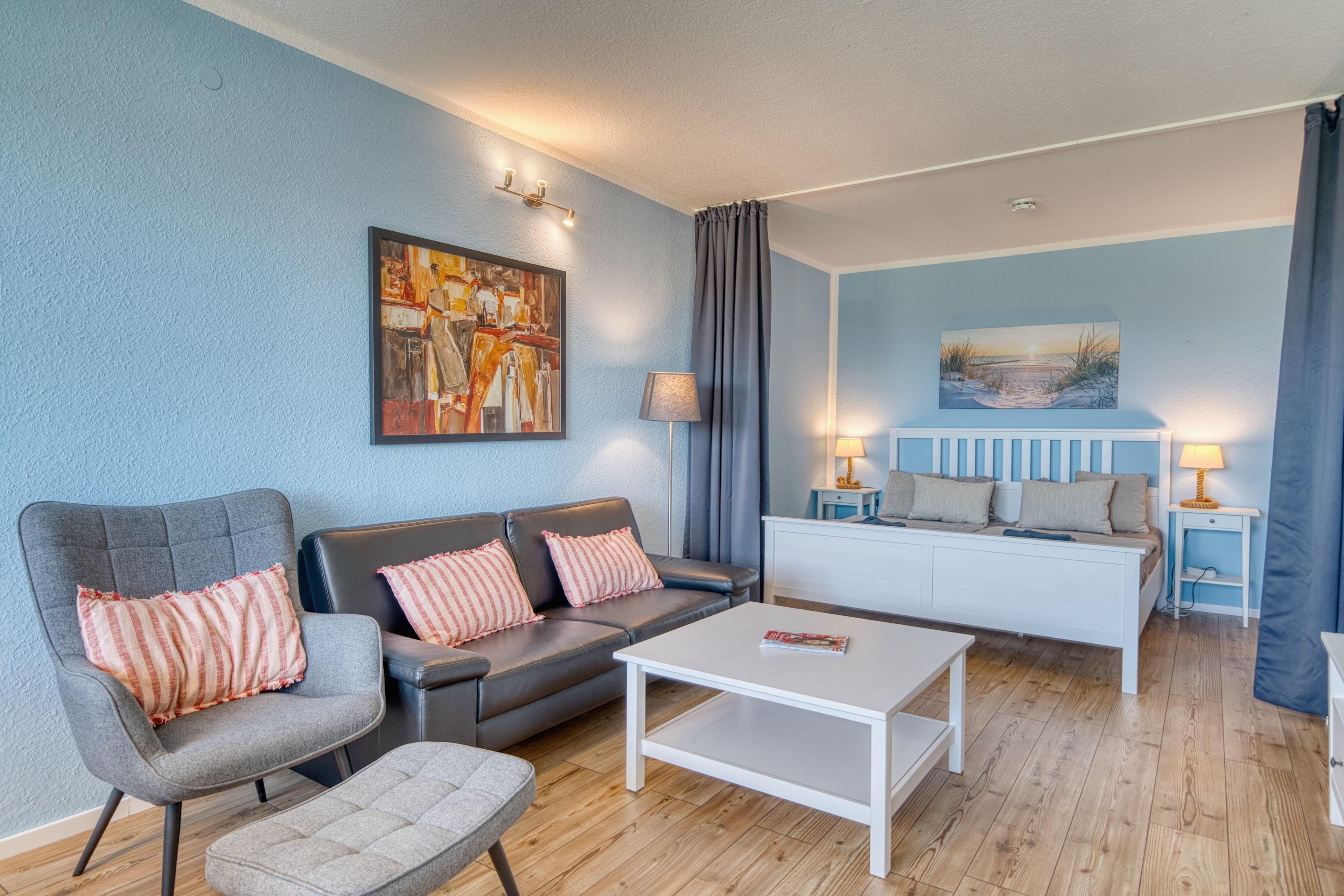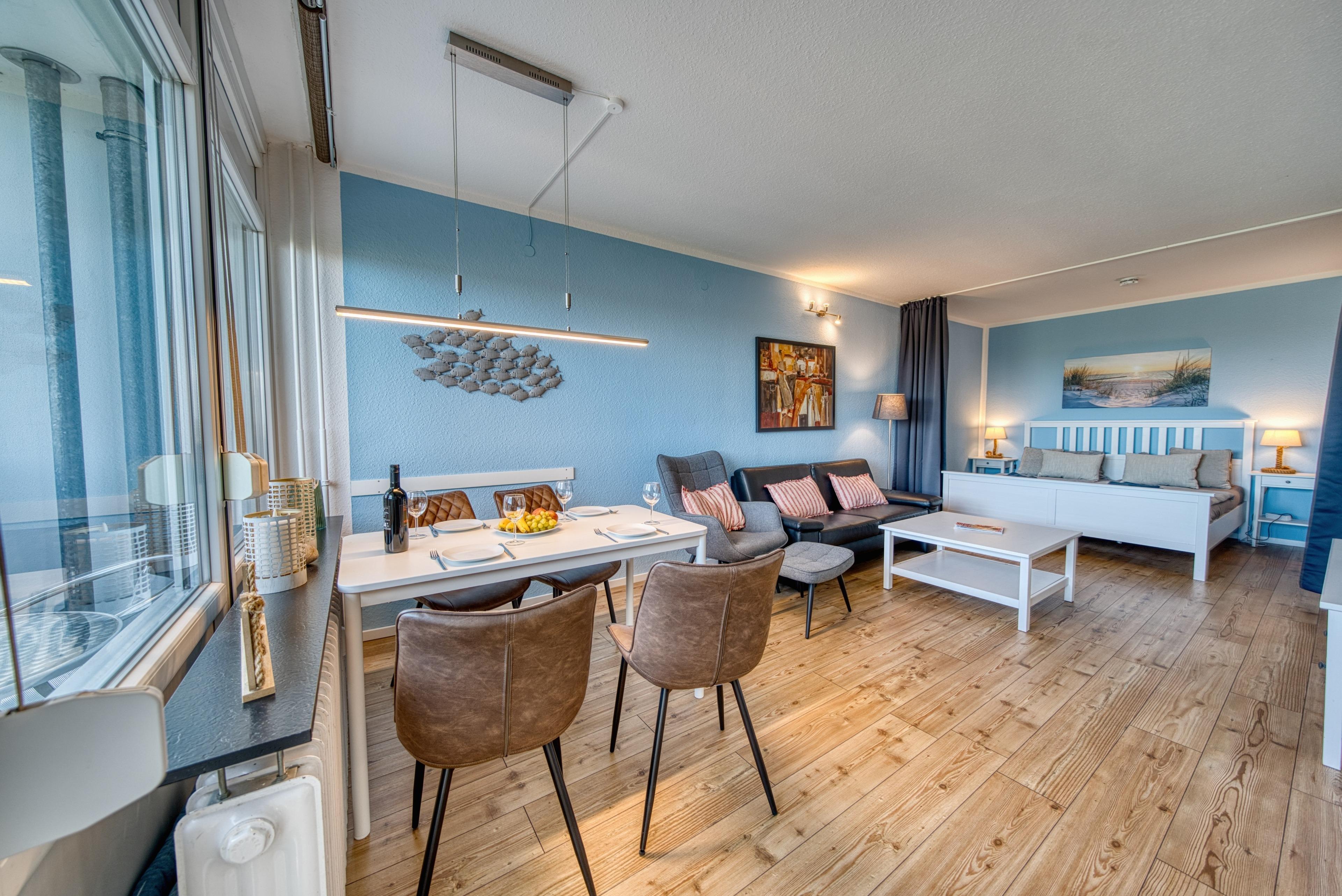 Wohn-/Schlafzimmer mit komfortablem Doppelbett, Sofa, Smart-TV und Esstisch direkt am Fenster