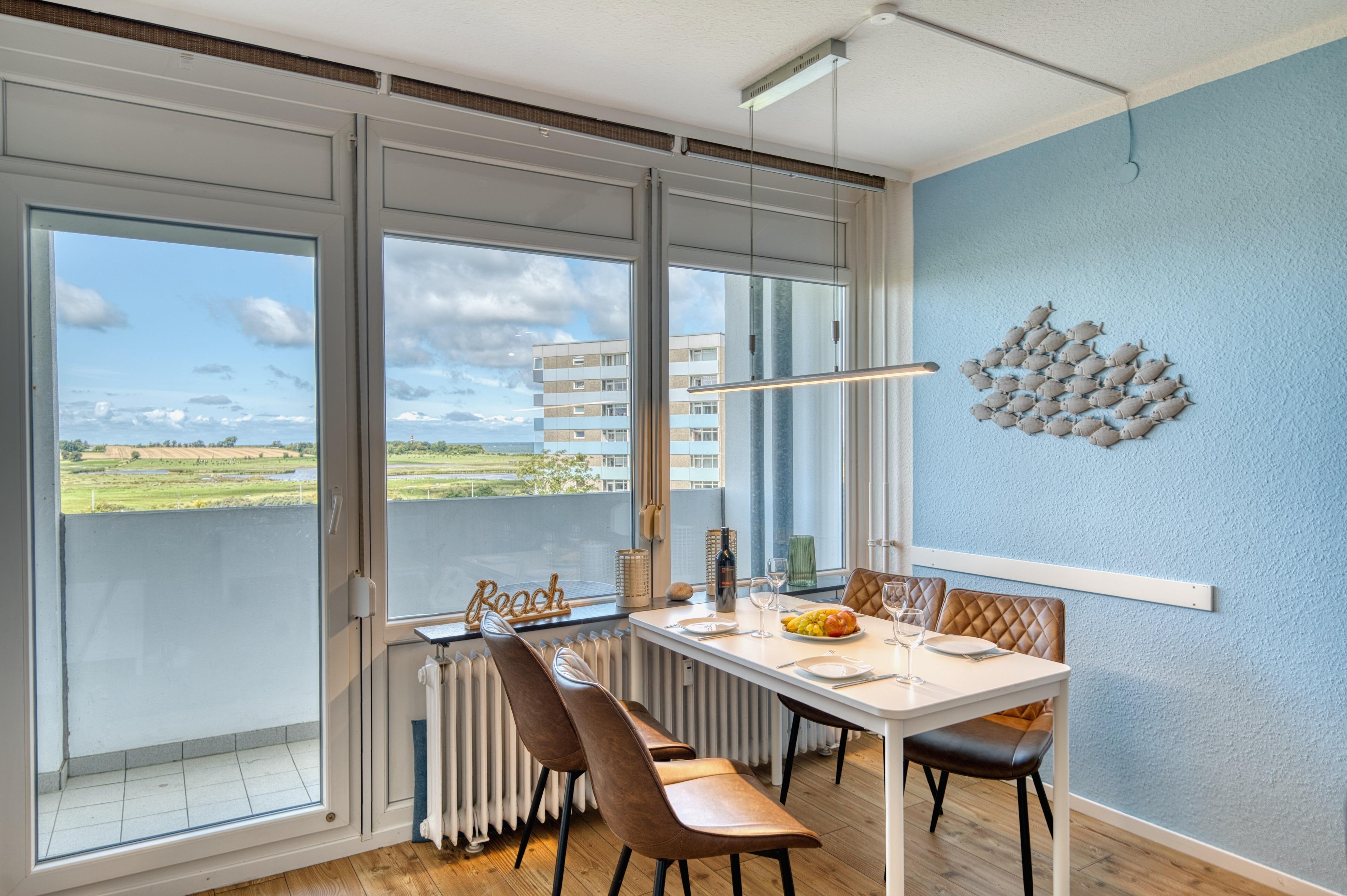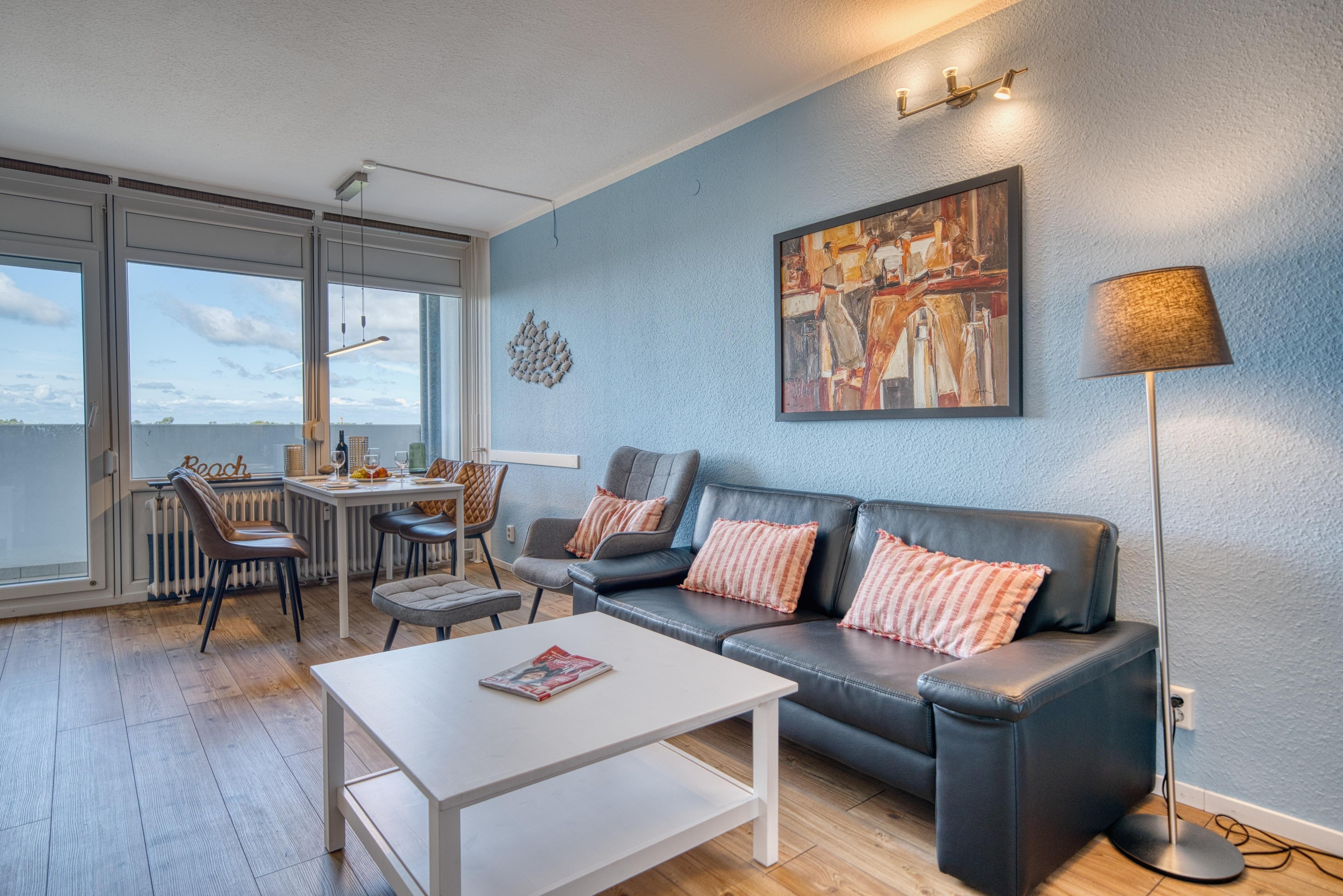 Diese gepflegte Ferienwohnung in der 5. Etage des Hauses M bietet auf 45?m² genügend Platz für bis zu 4 Personen. Der Balkon zur Ostseite lädt zu einem sonnigen Start in den Tag ein und der durchdachte Grundriss sorgt für eine angenehme Wohnatmosphäre – ideal für Familien mit Kindern.